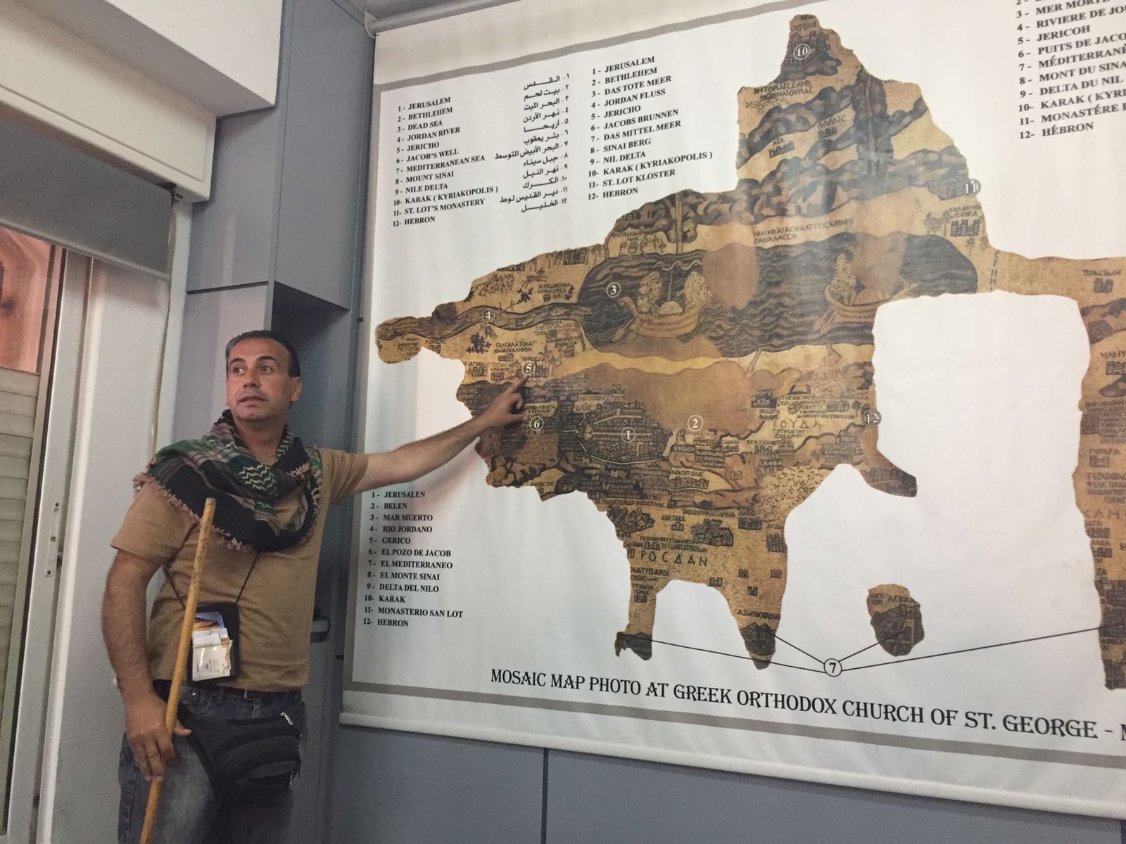 Onderweg waren genoeg mooie en bijzondere bezienswaardigheden te bewonderen. Neem nu het mozaïek stadje Madaba ,op de route langs de koningsweg, er ligt daar werelds grootste 6e eeuwse vloer mozaïek kaart van het heilige land in het middenoosten. Prachtig om die twee miljoen kleine stukjes steen zo bijelkaar te zien met zijn schitterende kleuren. Helaas is niet alles bewaard gebleven maar het is nog goed te zien dat het een kaart was. Hier op de poster staat hij in zijn geheel.