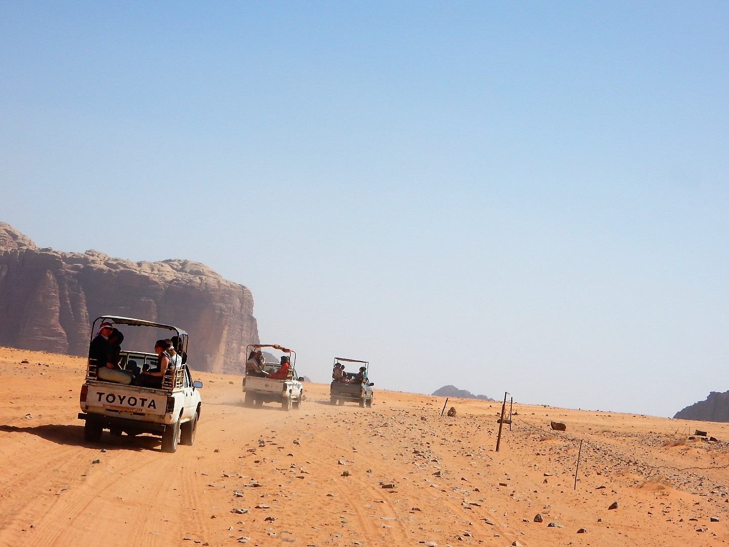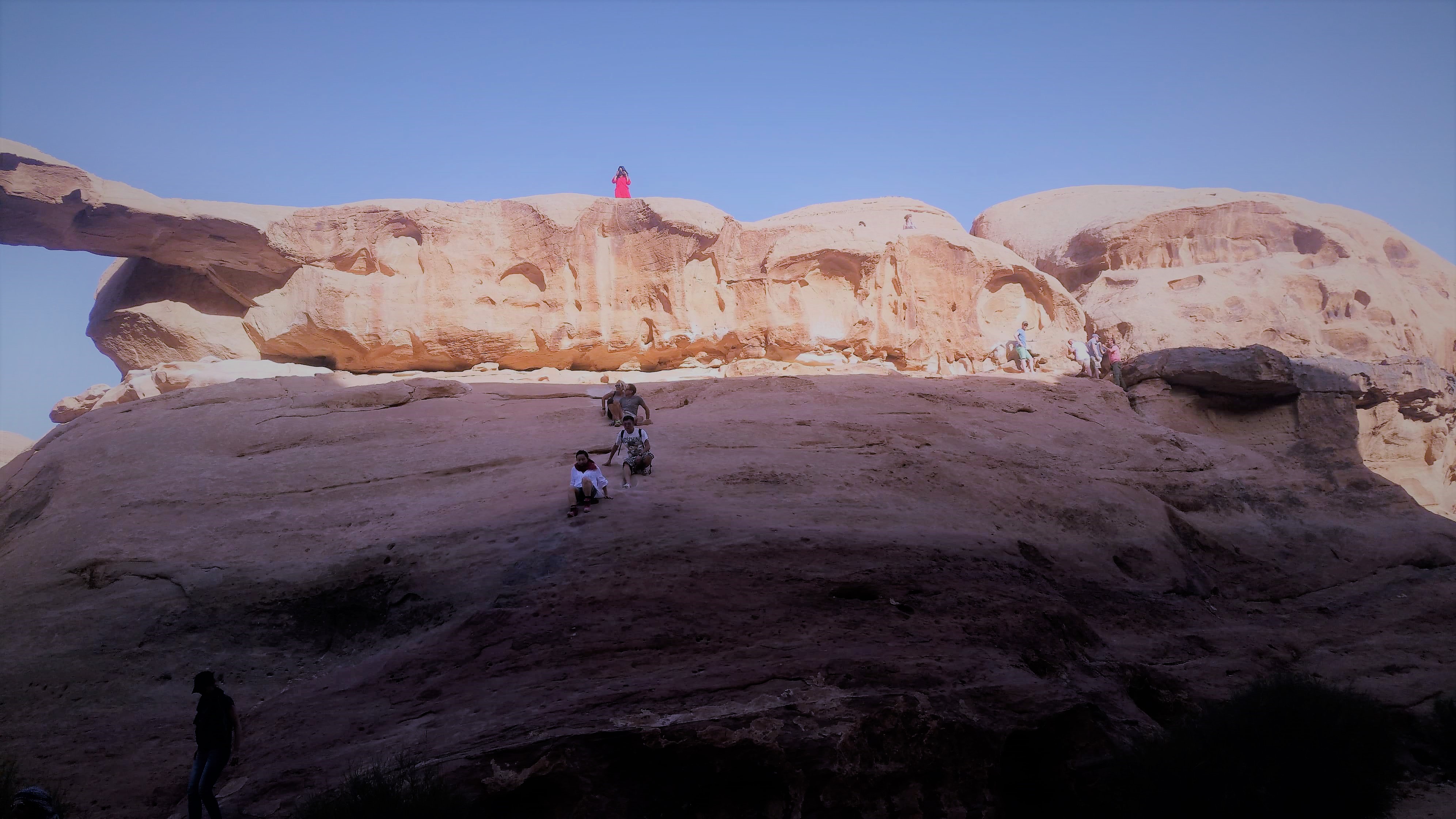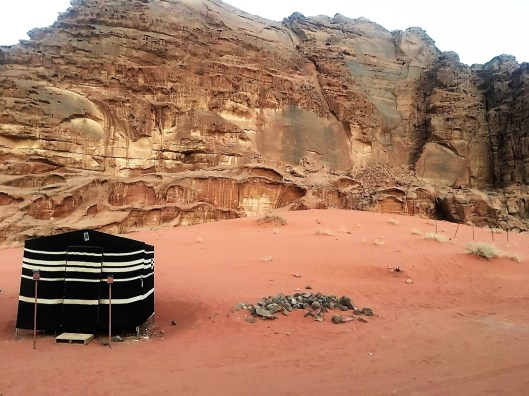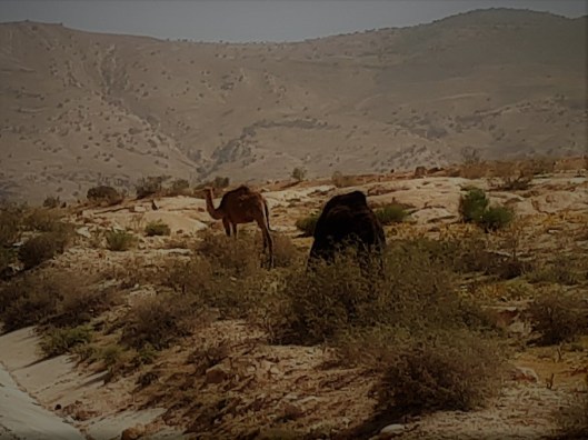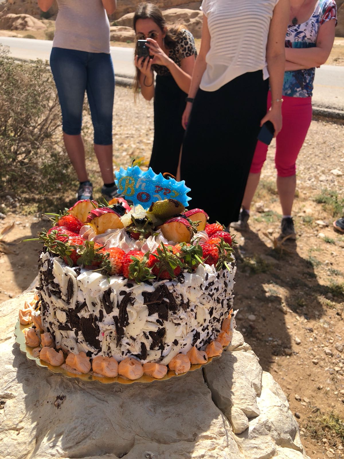 Onderweg er naar toe had Ferdi onze gids nog een leuke verrassing voor een jarige in de groep, midden in het ruige landschap hebben we taart gegeten, hoe speciaal is dat. We waren inmiddels vlakbij de favoriete plek van de oma van onze gids, een ondergrondse waterbron,heel apart om te zien zo midden in het droge landschap. Na dit korte bezoek reden we naar de Jordanese woestijn Wadi Rum. Met jeep reden we door het prachtige oranje, rode, bruine rots en grind woestijn landschap. Een bijzondere uitgestrekte vrijwel kale vlakte met zandduinen en her en der wat zandgras. Je ziet overal kamelen lopen, is weer eens wat anders dan koeien in het gras. Onderweg stopte we om salie thee te drinken in een tent maar ook om prachtige rotspartijen te bekijken. Mijn stoere dochter klom er natuurlijk weer op net als een paar andere waaghalzen. Na nog een stukje rijden net op tijd om de zonsondergang te zien, kwamen we bij een bedoeïenkamp aan, een rij tentjes waar 2 personen in kunnen slapen. Er stond een santitairhuisje, wat keurig netjes was en verder een grote tent waar heerlijke salades voor ons klaar stonden. Het vlees werd onder de grond klaar gemaakt in een diep gat, een paar uur stoven en je hebt een heerlijke maaltijd. Dit was echt rustgevend, onder de sterren hemel met geen enkele vals licht je maaltijd opeten. Er werd ook nog wat locale muziek gespeeld en we waanden ons in een sprookje van duizend en een nacht. Het slapen ging prima, helemaal niet koud gehad, hoewel de temperaturen s’avonds in de woestijn wel flink dalen. Helaas bleven we hier maar 1 nacht, van mij had het nog wel een nachtje langer mogen duren. |