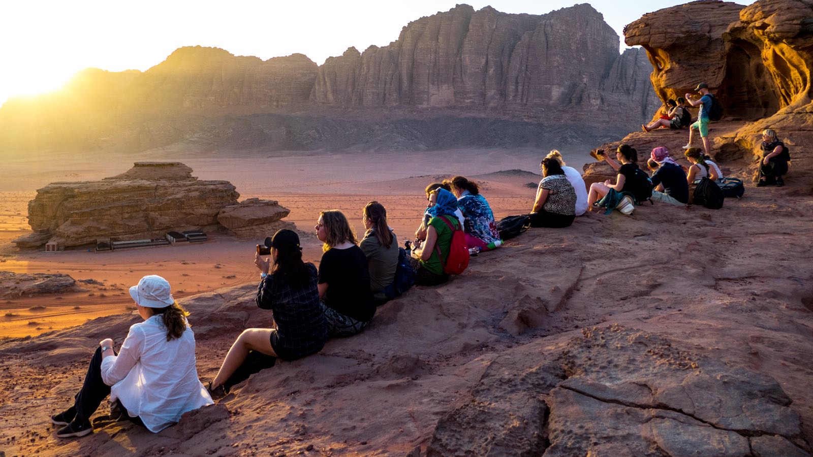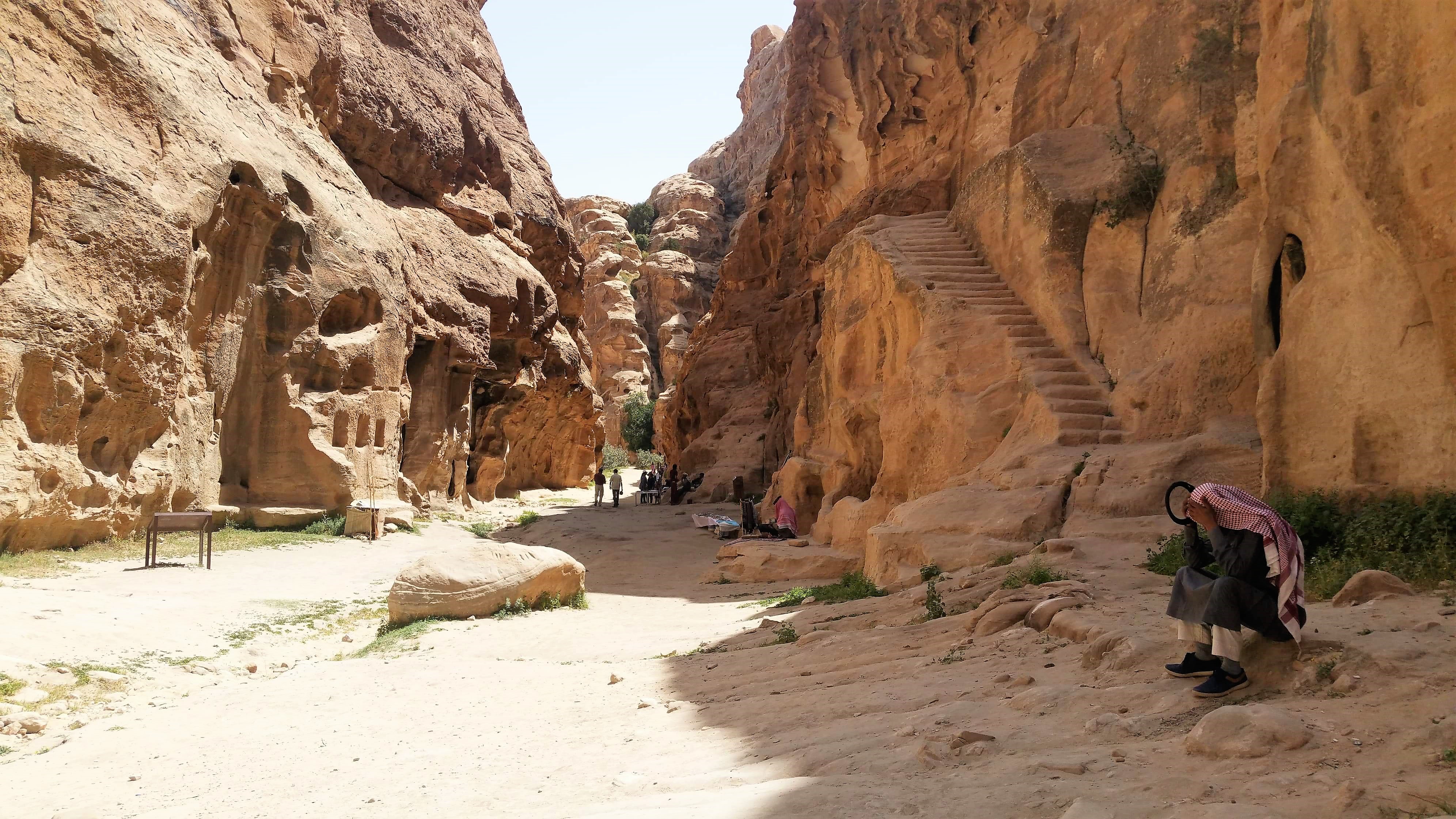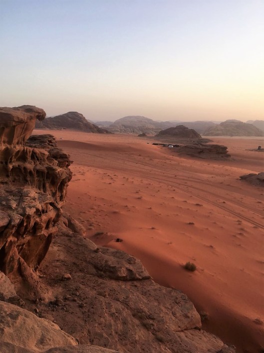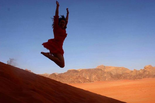 Onderweg er naar toe had Ferdi onze gids nog een leuke verrassing voor een jarige in de groep, midden in het ruige landschap hebben we taart gegeten, hoe speciaal is dat. We waren inmiddels vlakbij de favoriete plek van de oma van onze gids, een ondergrondse waterbron,heel apart om te zien zo midden in het droge landschap. Na dit korte bezoek reden we naar de Jordanese woestijn Wadi Rum. Met jeep reden we door het prachtige oranje, rode, bruine rots en grind woestijn landschap. Een bijzondere uitgestrekte vrijwel kale vlakte met zandduinen en her en der wat zandgras. Je ziet overal kamelen lopen, is weer eens wat anders dan koeien in het gras. Onderweg stopte we om salie thee te drinken in een tent maar ook om prachtige rotspartijen te bekijken. Mijn stoere dochter klom er natuurlijk weer op net als een paar andere waaghalzen. Na nog een stukje rijden net op tijd om de zonsondergang te zien, kwamen we bij een bedoeïenkamp aan, een rij tentjes waar 2 personen in kunnen slapen. Er stond een santitairhuisje, wat keurig netjes was en verder een grote tent waar heerlijke salades voor ons klaar stonden. Het vlees werd onder de grond klaar gemaakt in een diep gat, een paar uur stoven en je hebt een heerlijke maaltijd. Dit was echt rustgevend, onder de sterren hemel met geen enkele vals licht je maaltijd opeten. Er werd ook nog wat locale muziek gespeeld en we waanden ons in een sprookje van duizend en een nacht. Het slapen ging prima, helemaal niet koud gehad, hoewel de temperaturen s’avonds in de woestijn wel flink dalen. Helaas bleven we hier maar 1 nacht, van mij had het nog wel een nachtje langer mogen duren. |