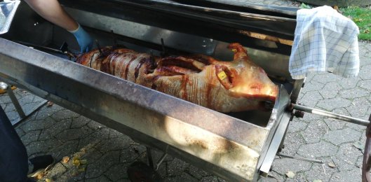 De avond van het feestje kwam er een kok het eten brengen en die had een varkentje aan het spit mee.