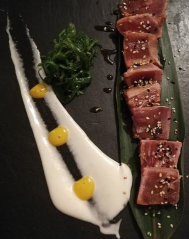 De gerechtjes zijn heel mooi op het bord opgemaakt. Enige minpuntje was dat we de enige waren in het restaurant gedeelte, bij de bar zaten wel mensen. De Spanjaarden eten hun belangrijkste maaltijd van de dag meestal tussen de middag en in de avond gaan ze dan naar de bar voor een klein hapje. Bij ons zit dat nog niet in het systeem. Maar ondanks dat het rustig was hebben we het toch erg gezellig gehad en voortreffelijk gegeten. De tonijn was super.