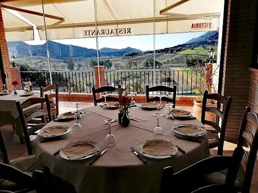 Na de inkopen zijn we doorgereden naar de streek Axarquía die begint net achter de berg bij Villanueva del Trabuco. Mijn af en toe knorrige vader vond het wel wat te ver rijden, Pap niet zeuren zei ik, je zal hier geen spijt van krijgen, 40 minuten van ons huis af en je komt in een werkelijk prachtig gebied, bij het dorpje Alfarnatejo, dat bekend staat als de Pyreneeën van het Zuiden van Spanje. Los Pirineos is een geweldig leuk restaurant met een glazen pui over de breedte van het restaurant, je kijkt zo over de vallei. We bestelde een menu del Dia, we zaten verrukkelijk te eten en we konden de rekening niet geloven en dat toverde een flinke glimlach op het gezicht van mijn vader, want voor een 3 gangen menu incl drankje betaal je daar maar 9 euro pp. Ja dat kan allemaal nog in Spanje. Het was een heerlijke middag,