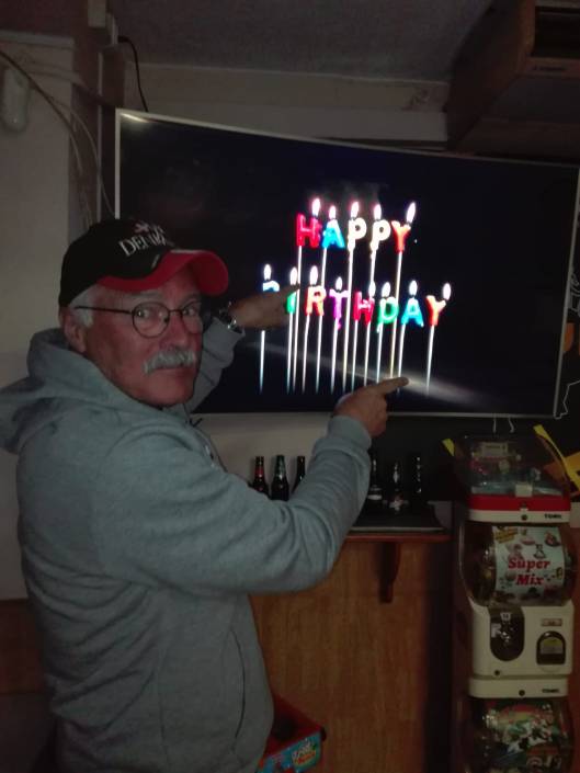 Om 12 uur werd de feestmuziek aan gedaan door de barman op de tv en er werd gefeliciteerd gezongen in diverse talen. Mijn vader is nu 72 jaar en zijn wens is uitgekomen, deze dag vieren met zijn eigen gezinnetje.