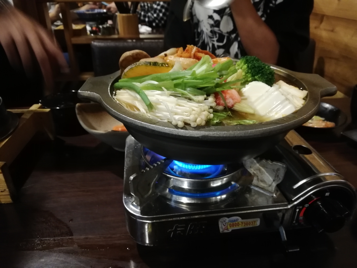 We bestelden vooraf sushi en als hoofdgerecht een hotpot wat bestond uit een pannetje bouillon met allerlei groenten en kruiden en daarin kun je je vlees garen. Super smakelijk en gezond maar wel ontzettend veel.
