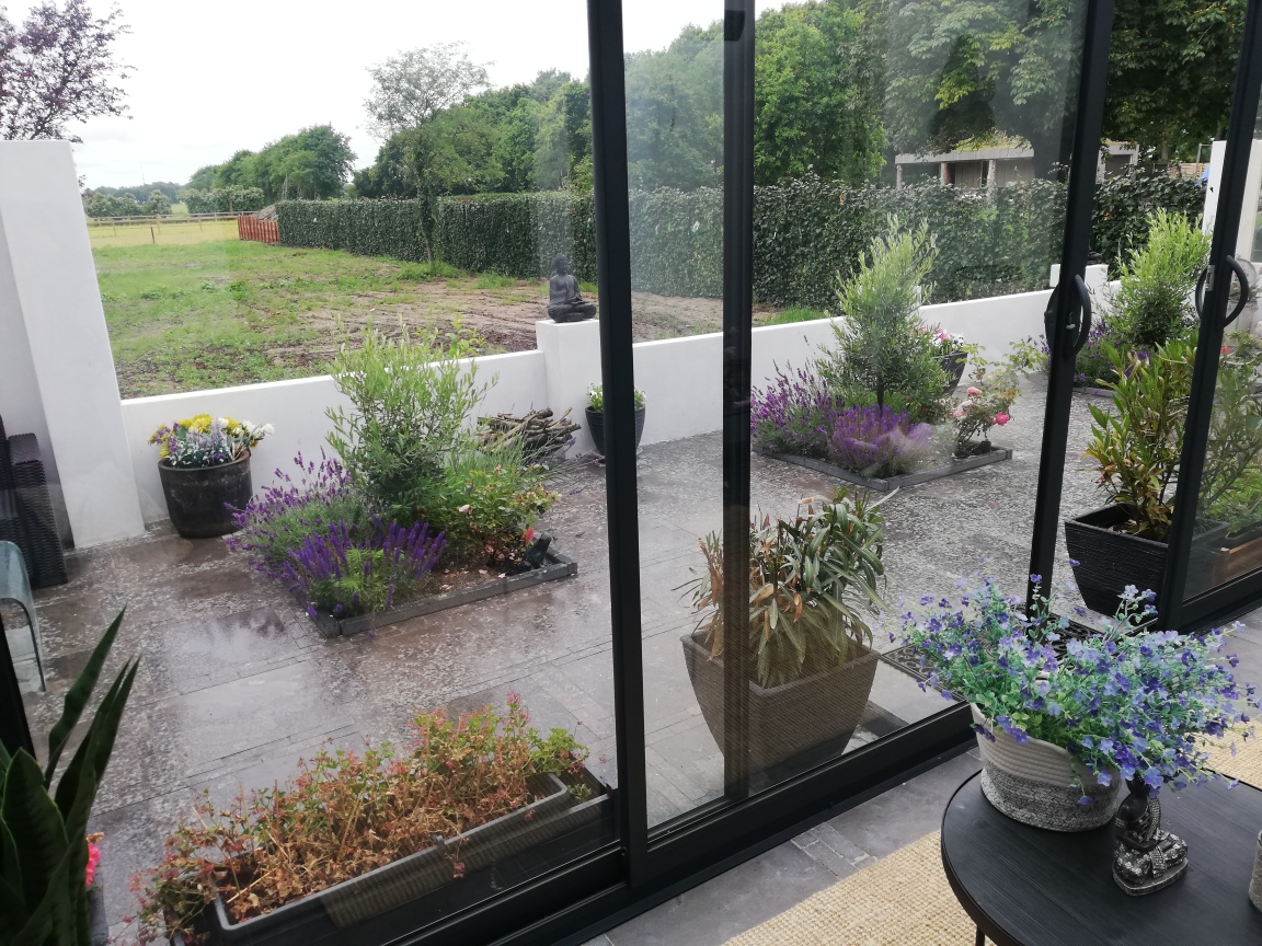 Over ons uitzicht bij ons nieuwe Nederlandse huis heb ik goed nieuws, ik heb de buurvrouw gesproken en ze gaat definitief geen palen plaatsen. Ze bleek ontzettend aardig te reageren en zei dat ze misschien Hedra wilde plaatsen maar na nog even verder gepraat te hebben en ze merkte dat ik ziek was van haar besluit een erfafscheiding te nemen, besloot ze het sowieso een jaartje uit te stellen. Nou ik hoop maar dat van uitstel afstel komt. Dit uitzicht is uniek.
