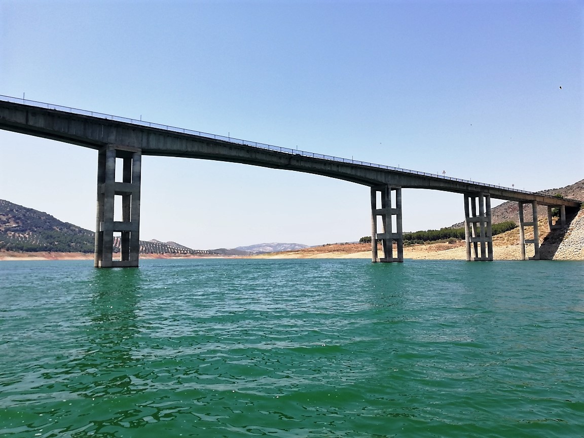 Omdat het het grooste stuwmeer is van Andalusie kun je nog al wat kanten op. We voeren nu onder de toegangsbrug naar Iznajar door, vorig jaar was hier een ernstig ongeluk gebeurd. Een ervaren piloot wilde stunten en vloog onder de brug door in zijn gyrocopter, door de laaghangende zon had hij niet gezien dat er achter de brug een elektriciteit kabel over het water gespannen was en vloog daar tegen aan, je kan wel indenken wat er toen gebeurde, vreselijk. De twee man die erin zaten overleefde het ongeluk niet.
