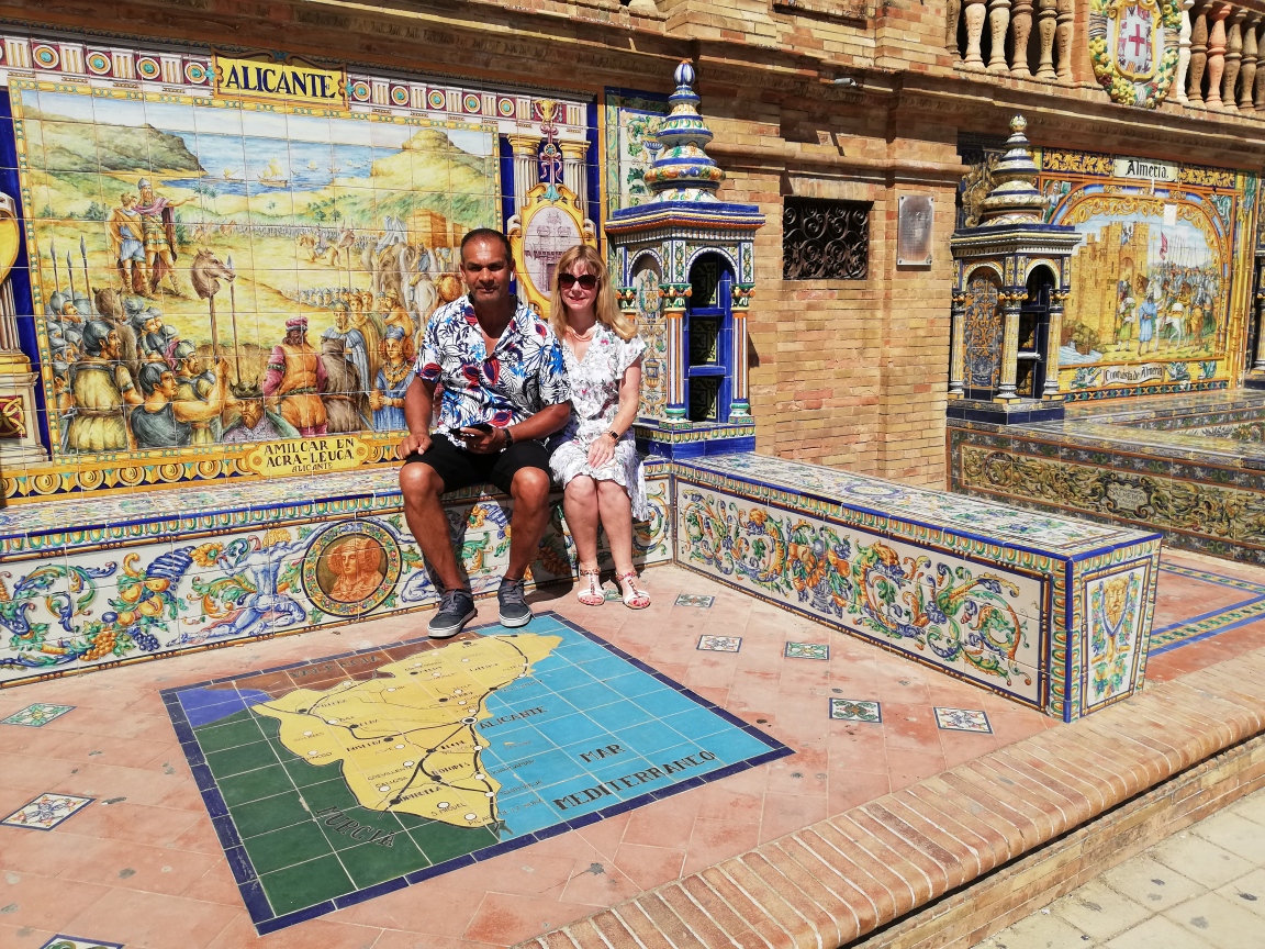 Het plein ligt net even buiten het historische centrum maar prima te lopen. Het was eind september maar nog steeds bloedje heet. Onderaan de gebouwen staan tegelmozaïeken waarop alle Spaanse provincies zijn afgebeeld. Ik vind het zo leuk dat ons piep kleine dorpje Villanueva de Tapia daar ook op afgebeeld staat. Helemaal rechts in de bovenhoek van Malaga.