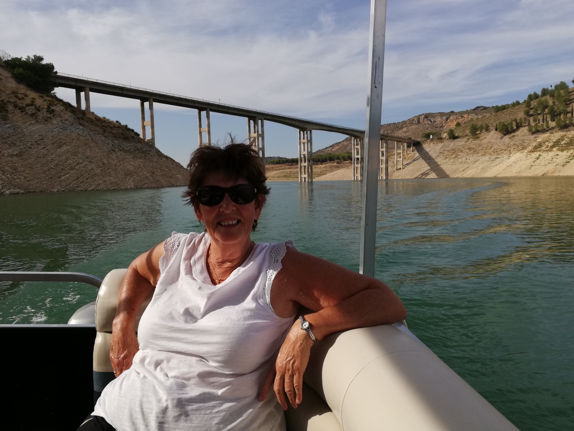 Maar ik zag ook mijn moeder lekker genieten. Heerlijk de wind door haar haren en genieten van de zon, het is nog steeds zomer hier. Ze genoot ook van de mooie natuur, alleen het water staat extreem laag, maar 30% van de hoeveelheid wat er in kan. Er gaat veel drinkwater vanuit het meer naar Sevilla.