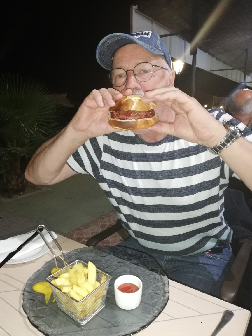Mijn ouders gaan heerlijk een maandje nog blijven hier in Spanje met z’n tweetjes. De weervoorspellingen zijn gunstig dus dat wordt vast lekker genieten voor ze. We hadden alleen vernomen dat Manolo halverwege oktober op vakantie gaat dus we besloten om wederom een hapje te doen bij onze goede vriend. Wij aan de tapas maar mijn vader had wel zin in zo’n lekkere sappige Angus burger. Heerlijk om hem zo te zien genieten.