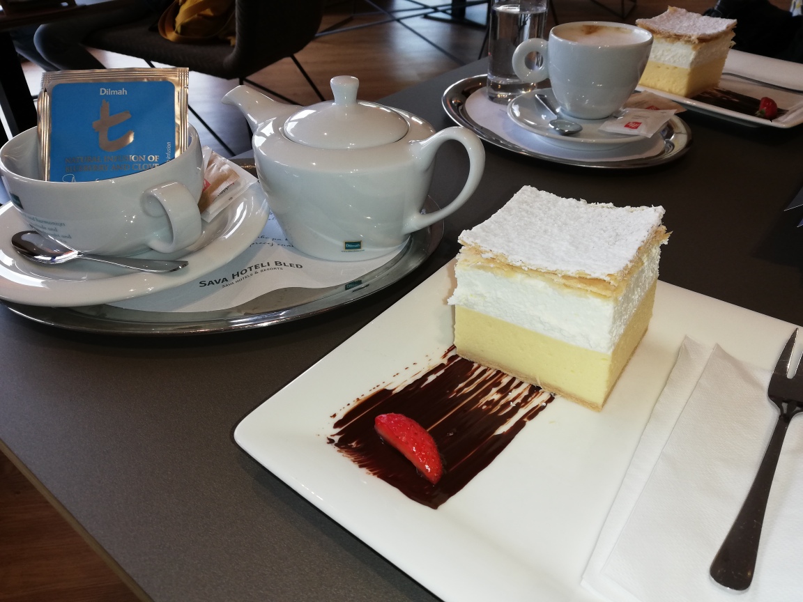 Omdat we zeer vroeg aangekomen waren in Bled, rond koffietijd, was het direct tijd voor de beroemde Creme cake bij Hotel Park, maar je kan ook ander plekje kiezen om dit gebakje, wat je doet denken aan de Nederlandse tompoes, te nuttigen want het wordt werkelijk overal rond het meer geserveerd.