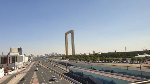We reden langs het schilderij frame wat precies tussen de oude en de nieuwe stad in ligt. Geopend in 2018, er staan twee torens van 150 meter hoog en daartussen ligt een glazenbrug van 93 meter, je kan daar op lopen, wat een schitterend uitzicht oplevert.