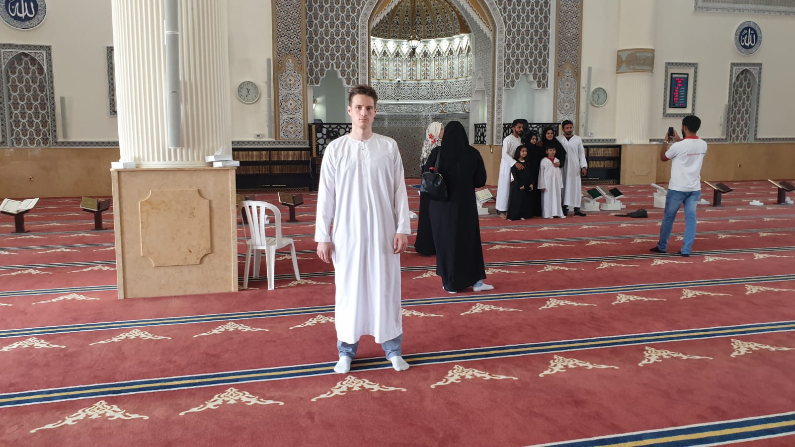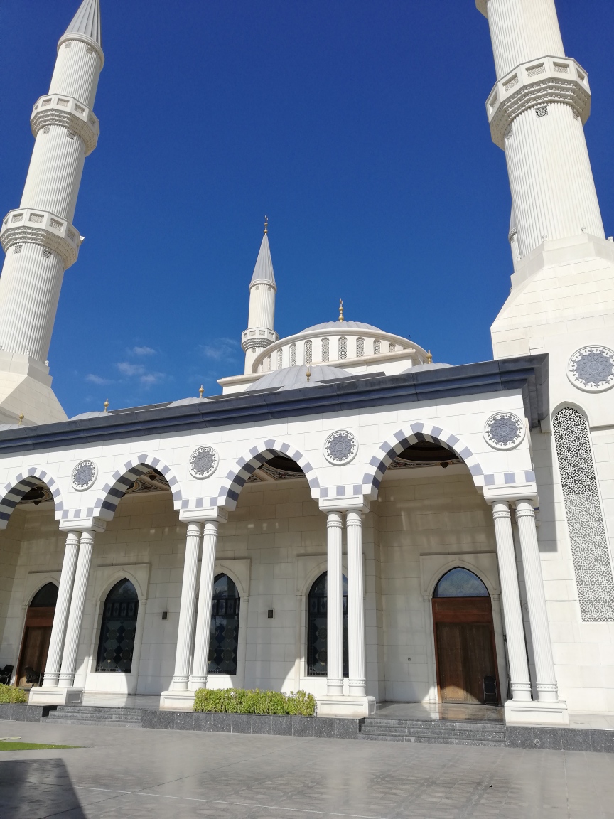We hadden een stop bij de blauwe moskee, deze moskee is geïnspireerd op de blauwe moskee uit Istanboel en het is gelegen in een woonwijk, de naam is Al Farooq Omar Bin Al Khattab-mosque, het is 1 van de 3 moskeeën die bezoekers van alle geloofsovertuigingen binnenlaat. Alle bezoekers worden gevraagd zich respectvol te gedragen. Vrouwen worden gevraagd om gedurende bezoek een sjaal rond hun hoofd te dragen en de schouders te bedekken, er is traditionele kleding voorhanden om te lenen. Natuurlijk gingen wij net zoals de locals gekleed naar binnen en of course ook zonder schoenen.