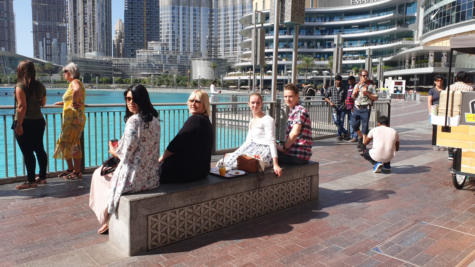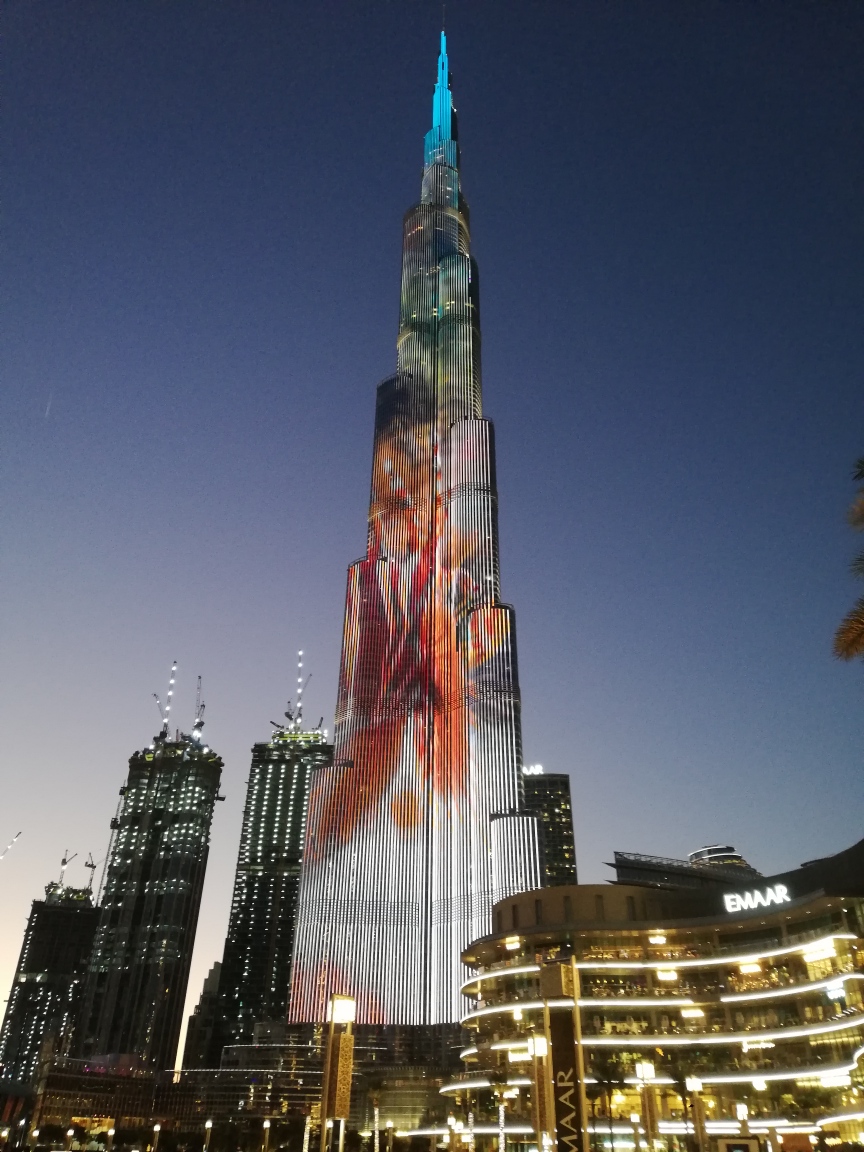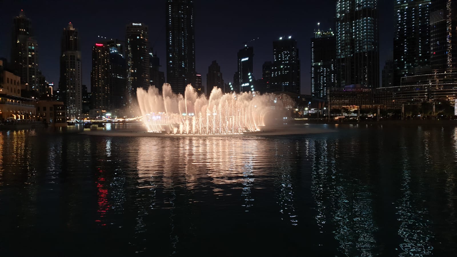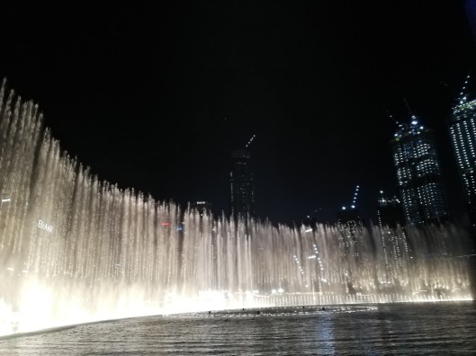 We aten s’avonds bij een restaurant aan de fontein en elk half uur zagen we een mooie watershow met daarbij het ene half uur Klassieke muziek en het andere half uur was er een pop song te beluisteren en als klap op de vuurpijl werd de hoogste toren van de wereld, de Burj Khalifa ook prachtig verlicht met de mooiste kleuren.