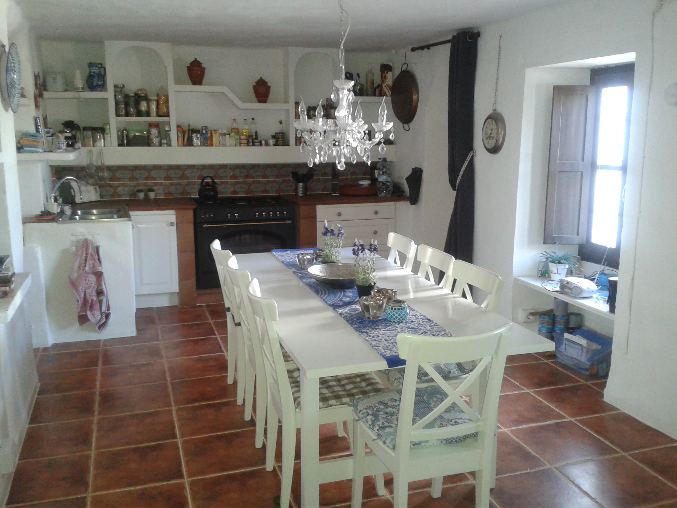 De vloer was klaar en was prachtig geworden en nu de meubeltjes er nog bij om het helemaal af te maken. Zelfs deze meubels hebben we gepimpt door een nieuw stofje of ander kleurtje te geven. De openhaard is helemaal opnieuw zwart gespoten en we hebben er een nieuwe palletkachel bij. In de zomer zit je vrijwel niet binnen maar in de winter s’avonds wel natuurlijk. Het is een heerlijk knus huis geworden. Of het nu in de gezellig eetkeuken is of in de woonkamer het voelt echt als thuis.