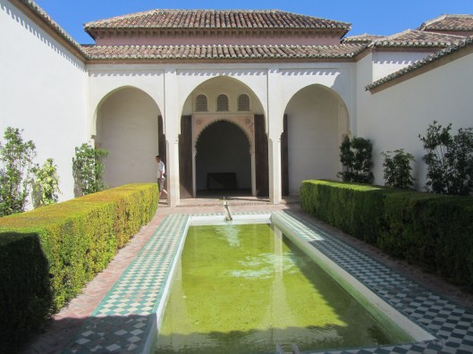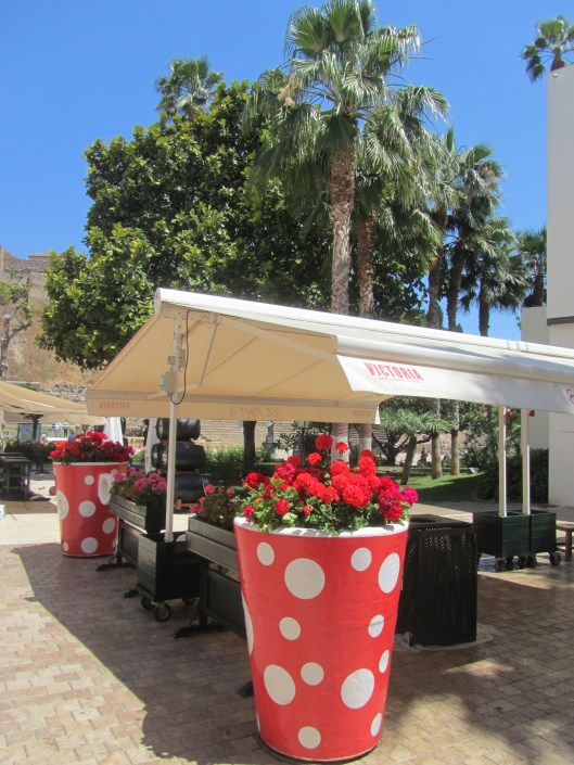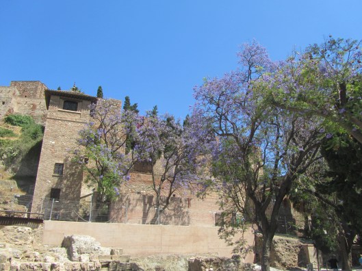 Maar buiten op het terras zie je de prachtige Jacaranda bomen, nu in de maand mei, helemaal paars kleuren met op de achtergrond Teatro Romano, Alcazaba en Gibralfaro. Wij noemen dat stukje het mini Alhamabra.
