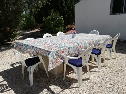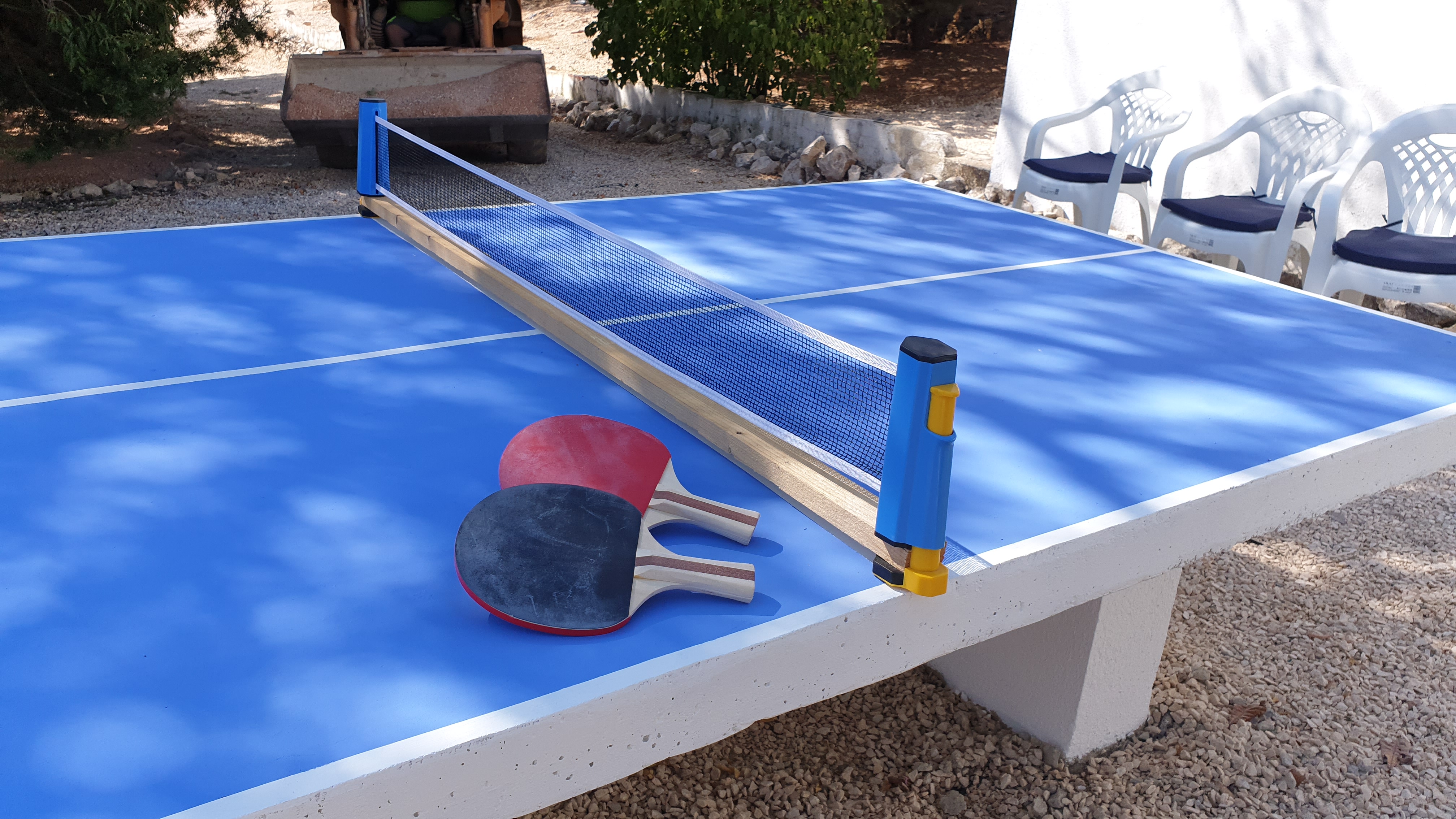 We kunnen hier lekker aan zitten eten met z’n allen maar ook een sportieve activiteit doen als we het tafelkleed eraf halen en de stoelen opzij zetten. Helaas was het netje wat ik had meegenomen niet breed genoeg voor de rand van de tafel maar dit gaan we oplossen met een latje. Die gaan we ook nog blauw verven en dan is het helemaal perfect en kun je het zo op tafel zetten wanneer je wilt spelen.