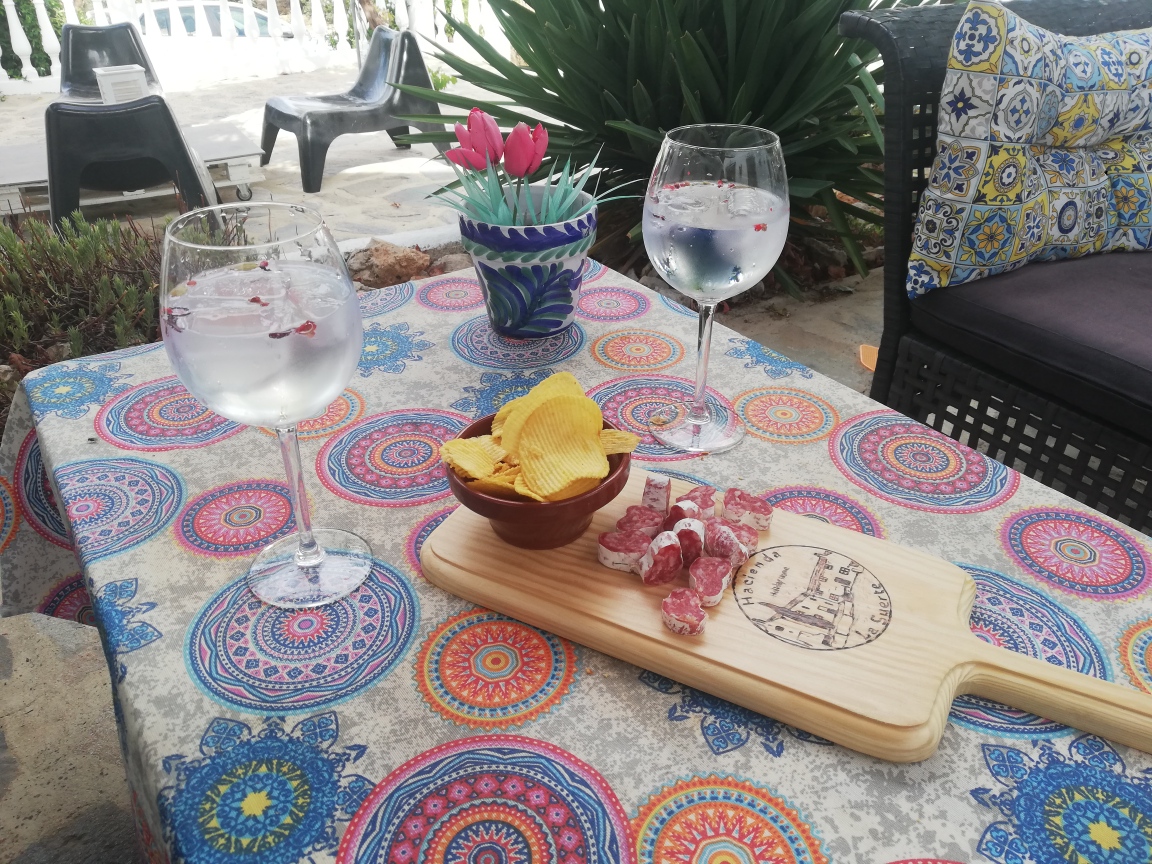Ons huis lag er nog goed bij, ondanks de schade die een paar gasten hadden aangericht maar natuurlijk als je daar bent zie je nog genoeg klusjes te doen van tuinwerkzaamheden tot verfklusjes. Maar eerst relaxen met een hapje van een plankje met ons eigen logo (gehad van mijn broer) met daarbij een koele Gin Tonic, want de Spaanse temperaturen raken makkelijk de dertig graden.
