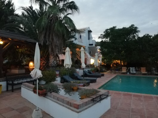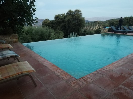 Uiteindelijk bleek Cortijo La Haza eigenlijk heel dichtbij ons te liggen maar 10 km. Vanuit ons rij je richting Iznajar en dik voor het dorpje moet je links af de bergen in, een smal geasfalteerd weggetje, maar prima te doen, maar alleen de laatste bocht omhoog (een heel klein stukje) is een beetje eng, maar als je dan boven bent vind je een geweldige plek. Wanneer je de poort doorgaat kom je in een oase van rust, een super mooie romantische plek met veel groen om je heen en allemaal leuke hoekjes en plekjes waar je kan zitten en last but not least een spectaculaire infinity pool.
