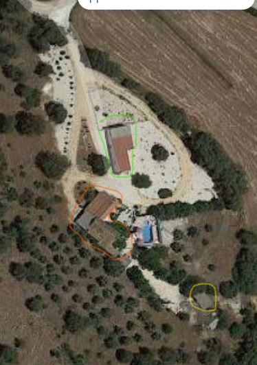 Daarop staat een dubbel woonhuis (oranje cirkel), ja kastraal gezien zijn we eigenaar van 2 huizen, je ziet tevens een grote studio (licht groen omcirkeld) en nog een oud gebouwtje (geel omcirkeld). Als klap op de vuurpijl hebben we ook nog een eigen zwembad, jeetje wat een luxe allemaal. Natuurlijk kostte het wel een paar centen maar dan heb je ook wat.