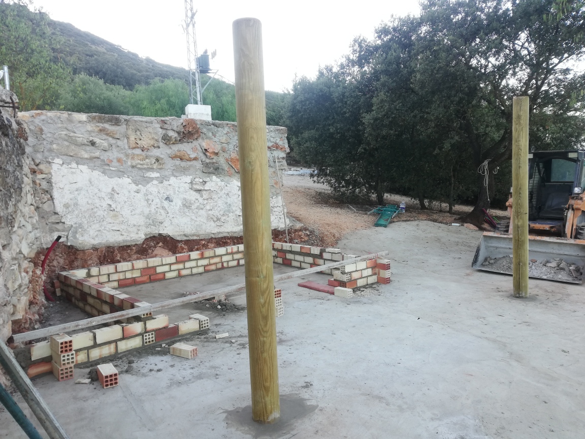 Het terras vordert gestaag, Wat zou het fantastisch zijn als het allemaal klaar is voordat de familie allemaal komt. De muur was inmiddels al opgehoogd met stenen en nu gaan ze verder met de overkapping.
