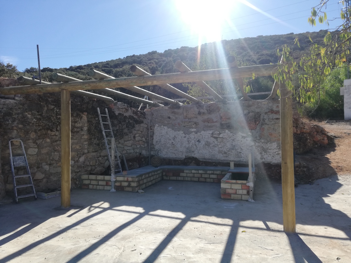 Mooie dikke balken voor de standers werden in het beton gemaakt en iets minder dikke balken voor de liggers komen er bovenop. Op de top wordt mimbre (riet) gelegd. Alles om een zo natuurlijk mogelijke look te houden wat precies bij de omgeving past.