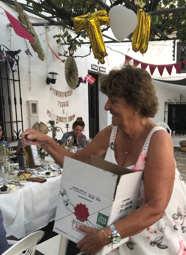Zondag zaten we nog lekker na te genieten van het geweldige feest van gisteren. Aan het eind van het diner gisteren werden we nog verrast door mijn ouders met een klein 100 ml flesje olijfolie uit de streek, die aangeschaft was bij de lokale olijffabriek in Tapia, die een prachtige winkel heeft naast de fabriek.