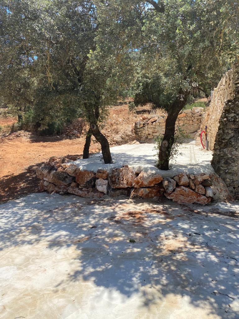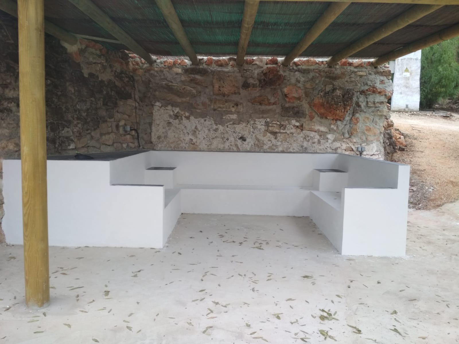 Nadat het beton gestort was moest er nog een muurtje op hoogte gemetseld worden rechts naast de kalkoven omdat we daar een overkapping wilden. Daarna werden de dikke houten palen voor de overkapping neergezet en het riet als dak bedekking erop gelegd. Tenslotte werd er nog een bankje gemetseld.