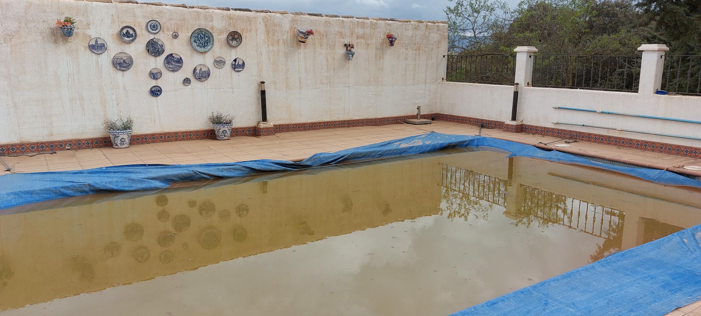 Nou ik kan je vertellen we werden er niet vrolijk van, wat een puinhoop, maar al met al viel het ons mee, we hadden ons op het ergste voorbereid. Alles had een kleiachtig oranje laagje, op het zwembad hadden we een zeil gelegd en daarop was goed te zien welke zooi eruit de lucht gevallen was. Maar met een beetje boenen en een tuinslang zal het weg te spoelen zijn dacht ik.