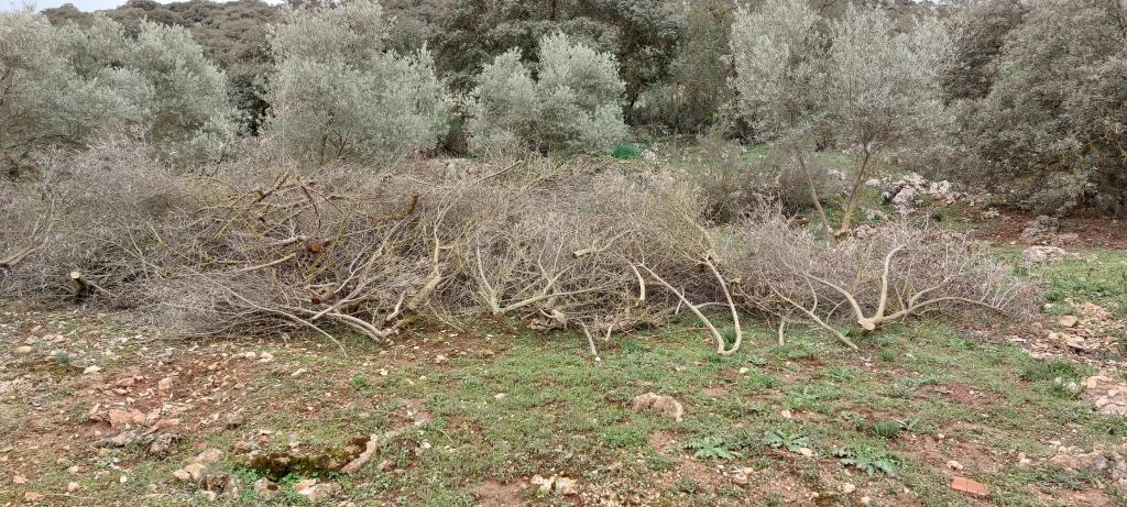 Maar we hoeven niet bang te zijn om ons te vervelen, in de tussentijd kunnen we in de tuin aan de slag. Er was een professionele Spaanse snoeier aan de gang geweest in januari, onze olijf en amandel bomen waren goed onder handen genomen, maar we schrokken wel van de takken die hij had afgezaagd. Soms zo groot en dik dat we het amper zelfs met z’n twee weggesleept kregen. Dat is de pech als je er niet bij bent, dan kun je niet aangeven hoe je het wilt.