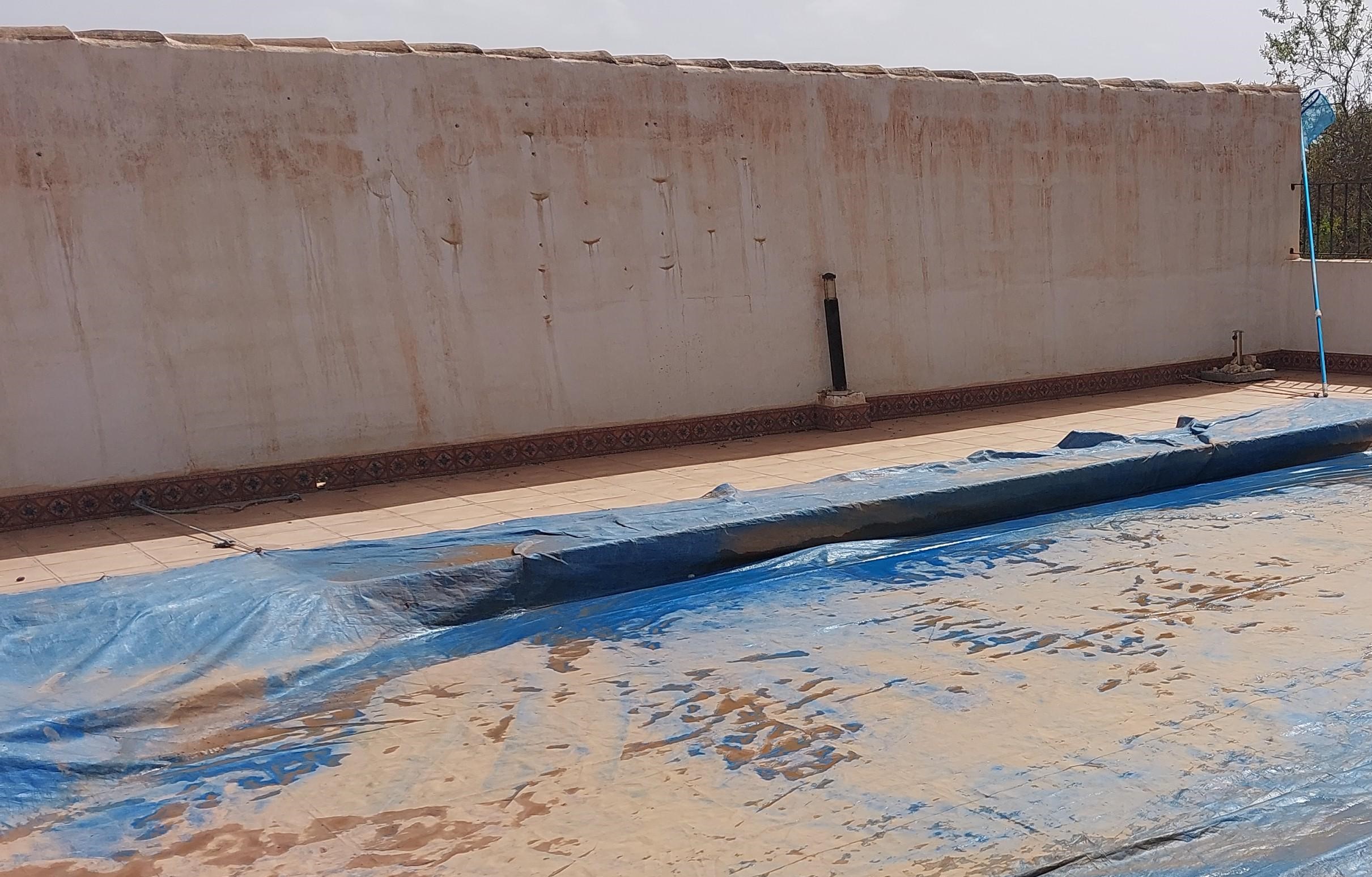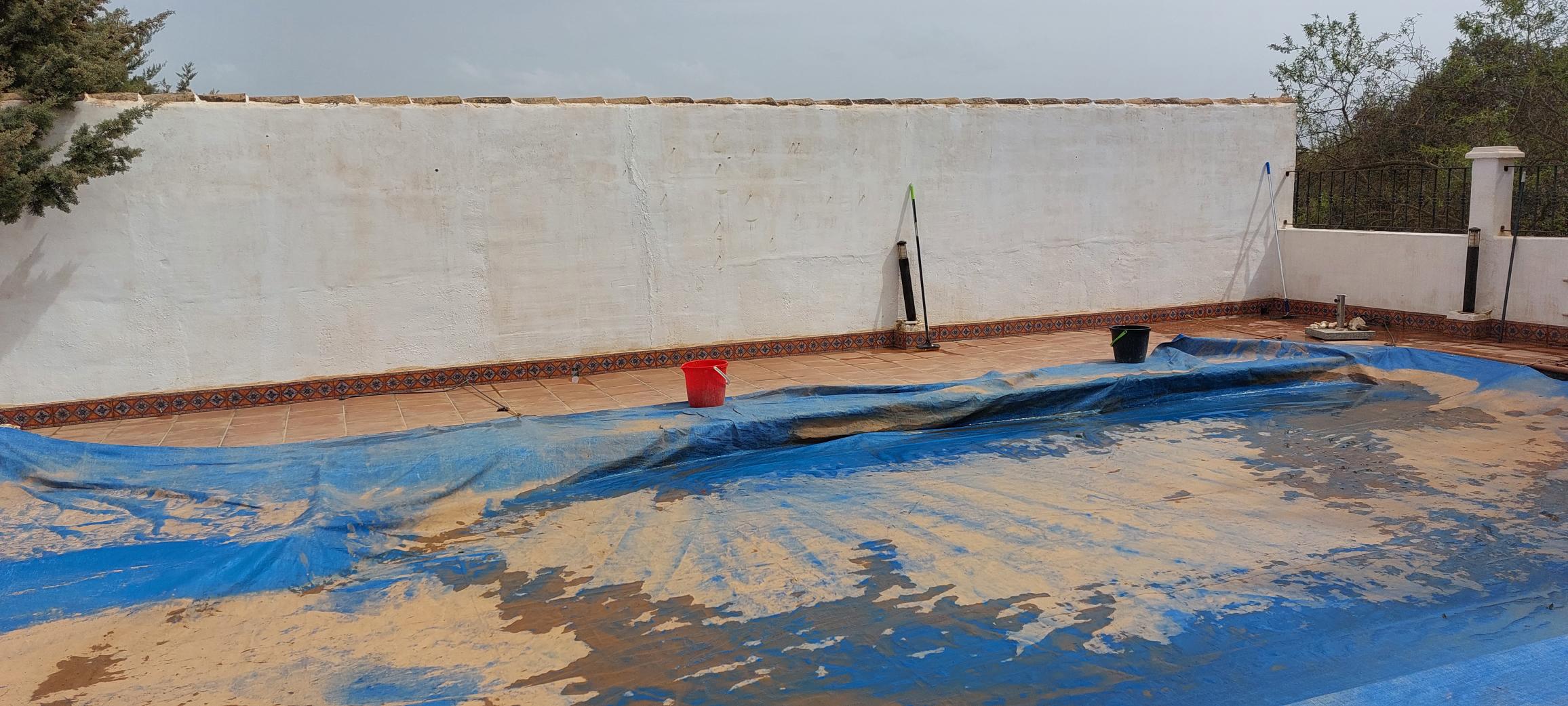 Het doek laten we nog even liggen, eerst maar even de weersvoorspelling afwachten en duimen dat er niet nog een oranje bui komt. Alle bordjes hadden we van de muur gehaald en toen zijn we begonnen met schrobben om het daarna af te spoelen met de tuinslang. We kregen er nu wel een beetje vuil af maar dat handgedoe was best intensief, met een hogedruk spuit zal het sneller gaan. Maandag maar even naar Malaga rijden om deze te gaan aanschaffen.