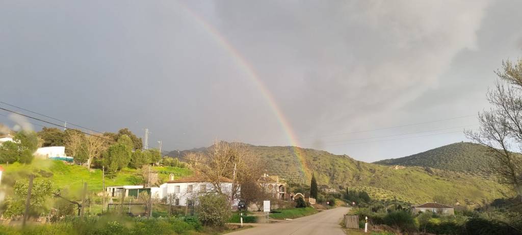 Daarom kozen we er deze keer voor om alles te gaan verbranden, dat was ook nog een behoorlijk klus kan ik je vertellen want je moet beginnen met een klein vuurtje, daarna de stammetjes van de takken afzagen deze op een hoop leggen om later nog kleiner te zagen en daarna de resten van de takken, tak voor tak op de brandstapel gooien om te verbranden. Paco, Lesley en ik zijn er de hele dag zoet mee geweest. We stonken natuurlijk als de malle aan het einde van de dag. We moesten ons goed wassen met goed ruikende schoonmaakmiddelen want er stond in Algarinejo een 13 gangen menu op ons te wachten bij Casa Piolas en daar moeten we natuurlijk spik en span aan tafel verschijnen. Onderweg daar naar toe werden we getrakteerd op een mooie regenboog en ja inderdaad aan het einde was een echte gouden pot, een gouden menu!