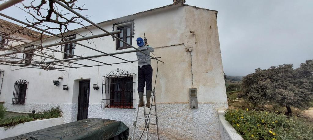 Helaas zat het weer nog steeds niet mee en soms stonden we in de regen te spuiten. Ook moet je elke 20 minuten even een kwartier stoppen om het apparaat niet oververhit te laten worden dus dat is ook wel een aandachtspunt. Maar langzaam aan zien we het hele huis opknappen. Leuk hé zo’n Spaans huis.
