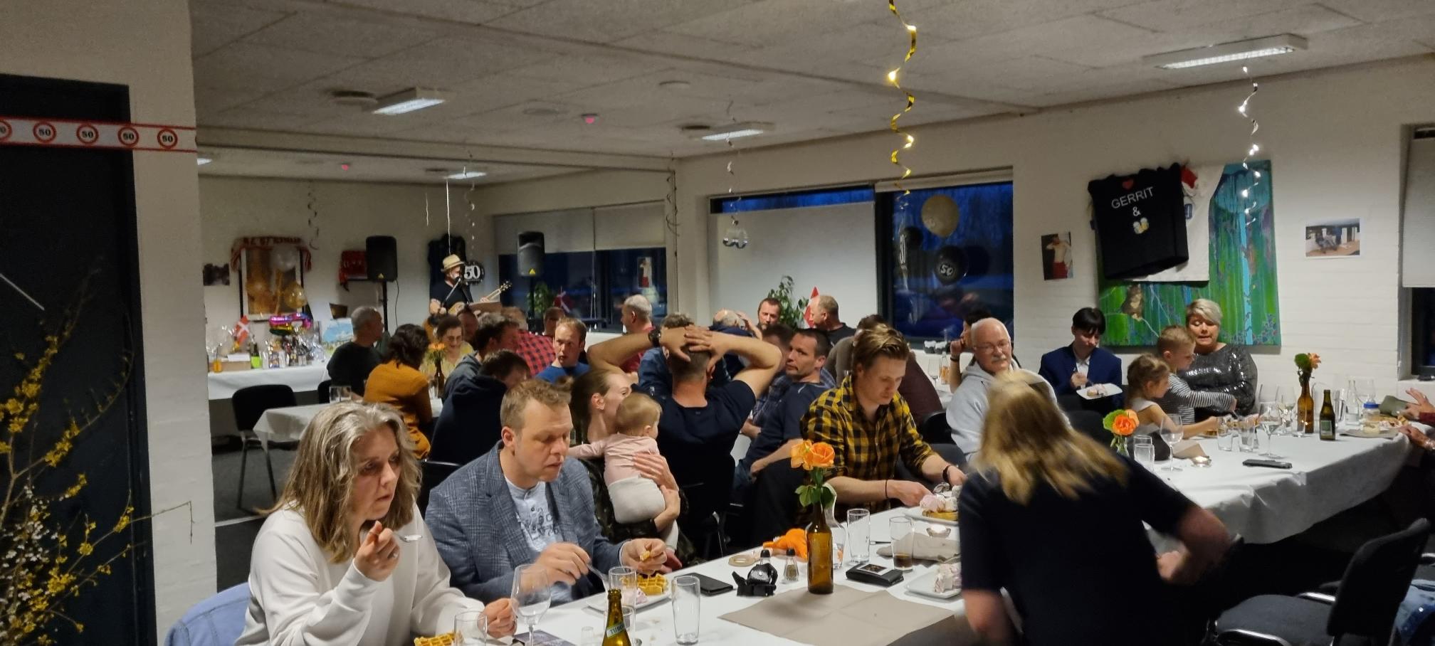 Er stonden lange tafels waar we konden aanschuiven en ook Nederlandse/Deense vrienden waren van de partij. Dat zijn voornamelijk Nederlandse boeren die nu een veebedrijf runnen of gerund hebben in Denemarken. Mijn broer heeft ook gewerkt in Denemarken bij een boeren bedrijf en de koeien gemolken dus hij kent het wereldje goed. Tijdens het Deense buffet speelde er een geweldige gitarist en na het eten werd er nog een quiz gedaan en iedereen lag dubbel van het lachen want Ramon en Esther moesten de vragen stellen met een kurk in hun mond, echt hilarisch.