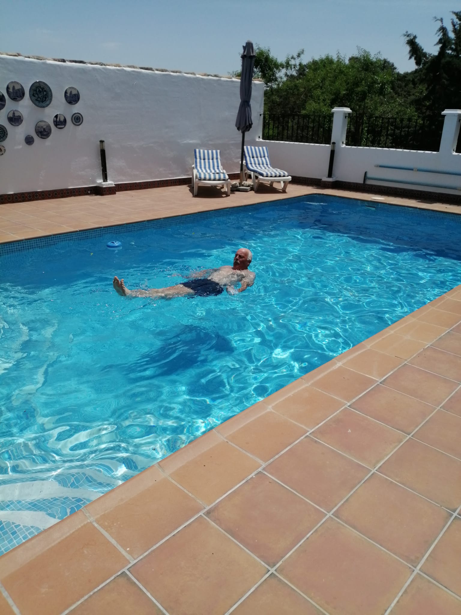 Het is warm in Spanje zeer warm, het weer is altijd wel goed deze periode maar nu is het extreem warm voor de tijd van het jaar, er is op het moment een ola de calor (hittegolf). Gelukkig is het zwembad op tijd gevoegd en weer gevuld met water, zonder kun je nu niet. Zelfs mijn papa ligt regelmatig in het zwembad, nou dat doet hij echt alleen als het bloedje heet is.