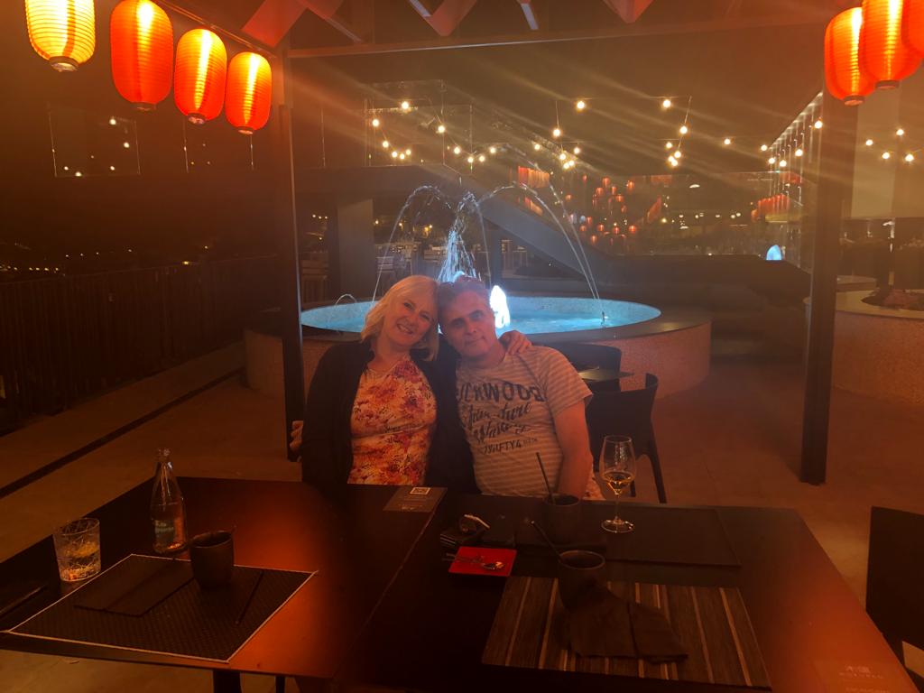 Wanneer het donker wordt ziet het er nog leuker uit met al die rode lampjes boven je hoofd en de fontein is ook mooi verlicht.