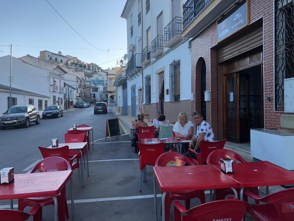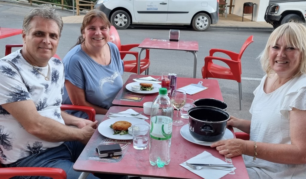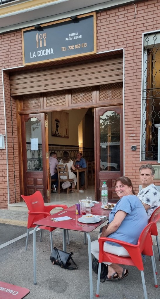 Na zo’n relaxdagje is lekker eten een fijne afsluiter, dit keer reden we naar Iznajar waar Elvira voor het eerst plaats nam bij de tafeltjes van la Cocina. Een restaurant waar je kan afhalen maar ook lekker ter plaatse kan eten, binnen of buiten, echt Spaans natuurlijk wel op de parkeerplaats! Regelmatig hebben ze hier thema avonden, dit keer was het thema vis, nu en dat is aan ons wel besteed. Ik koos voor een mosselpannetje vooraf en als hoofdgerecht een fantastische groene vis curry.