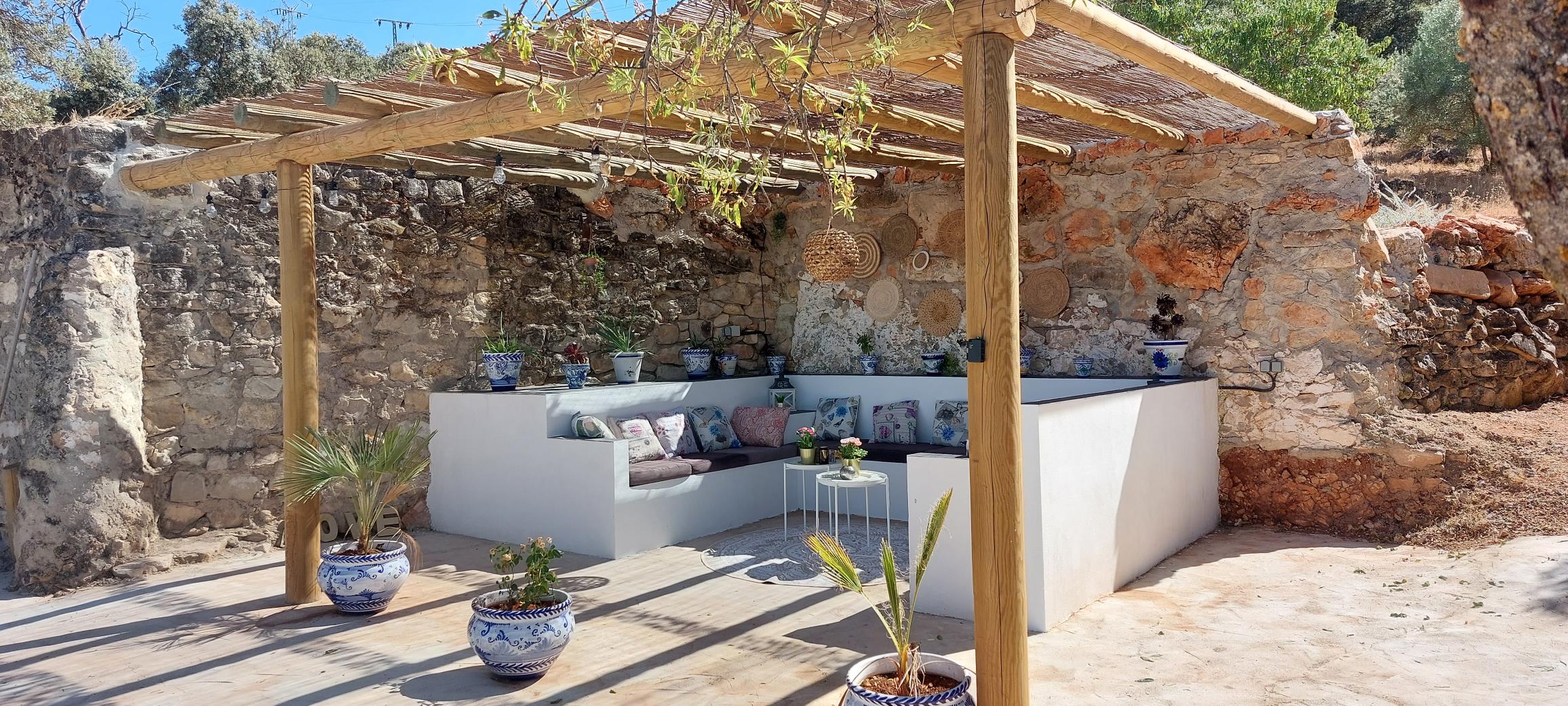 Daarom maar even bij de buiten plek gaan zitten onder het riet. Maar ondanks het riet komt er toch nog behoorlijk wat zon doorheen, beter is het als we hier ook een dakje op gaan laten maken bedacht ik me.