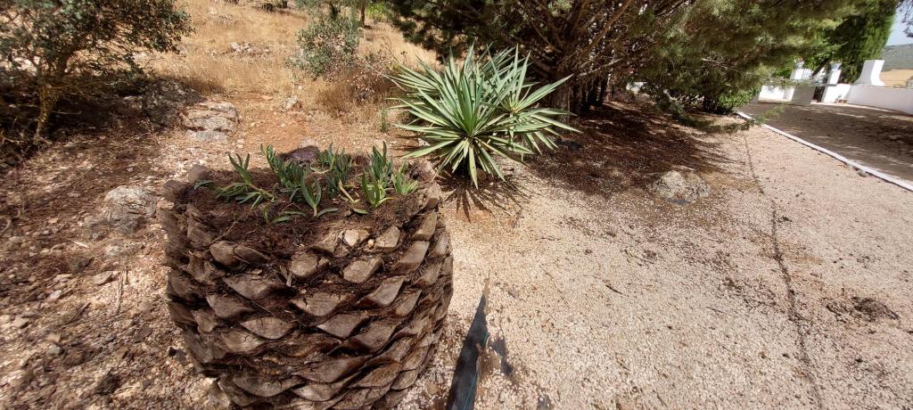 Ooit hadden we een mooie palmboom in onze tuin en toen kwam de rode palmkever en die verwoeste de boom van binnenuit. Zo ontzettend zonde, de helft van de dorre boom kregen we wel weg maar de onderkant stond nog zo stevig in de grond dat we deze niet zomaar konden verwijderen, toen bedacht ik me we gaan de boom gewoon een andere functie geven, niet die van boom maar die van een bloempot. Ik bedekte de bovenkant met aarde en deed er wat stekjes van klimplanten in. Ik vind het helemaal leuk maar nu duimen dat het ook goed blijft gaan.