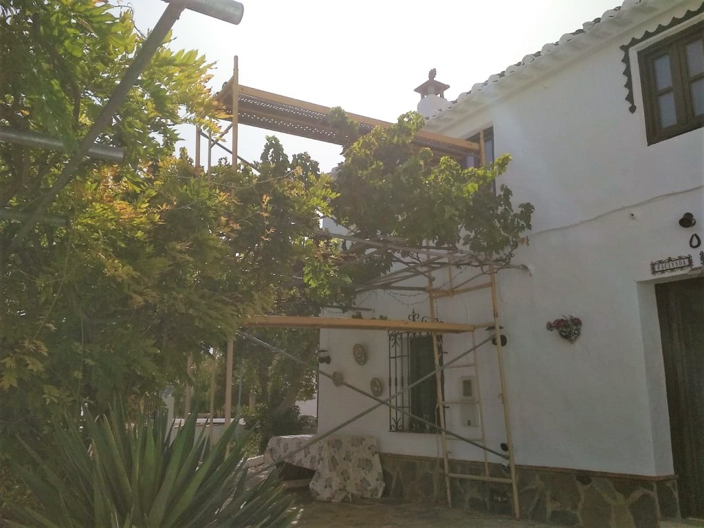 Er was ook al een tijdje een vochtplek in de gang, dat moet van het dak komen concludeerde we gelijk, er zal wel een pan scheef liggen, maar welke is dat dan. Zomaar even een laddertje tegen de muur zetten is ook geen optie met die hoogte. Dus moest er een stelling komen en de scheefligger moest opgespoord worden. De beste tijd om het dak op te gaan is oktober, net voor de mogelijke regen periode en de olijven pluk, want na oktober zijn er geen werklui meer te vinden, ze worden allemaal ingezet in de olijfboomgaarden.