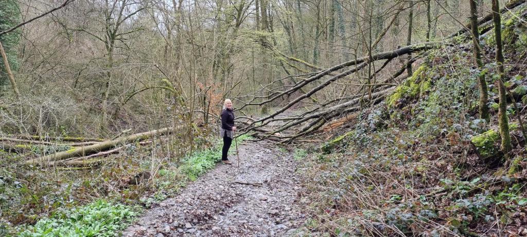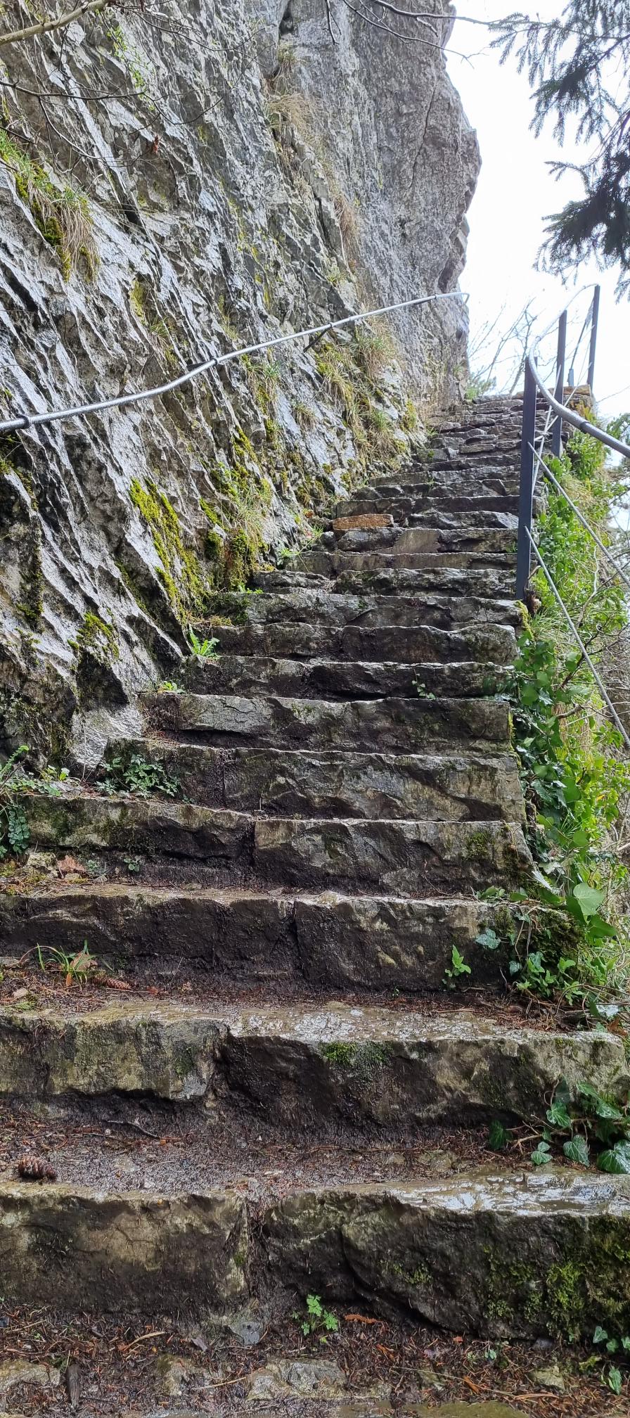 Het regende vandaag een beetje en dan is dat omhoog klimmen door een smal bospaadje best een uitdaging, ondanks onze ook al zeker 20 jaar oude Paulus schoenen. Je moet echt opletten dat je niet slipt of uitglijdt maar we waren hier nu toch en daarom wilden we wel perse een wandeling maken. Door een beetje regen laten wij ons niet gek maken, we krijgen daarvoor vele prachtige doorkijkjes en mooie vergezichten terug.