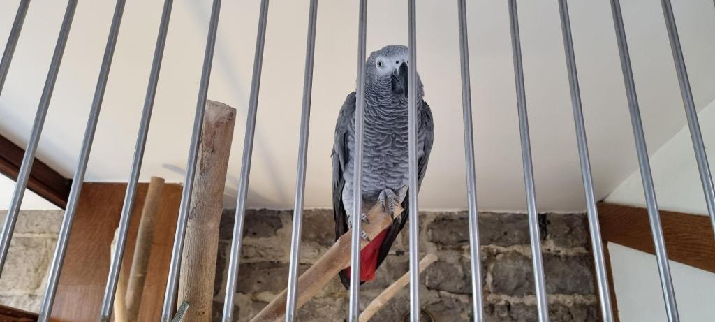 De papegaai was vrolijk aan het fluiten en riep de hele tijd bonjour, bonjour, zo gezellig.