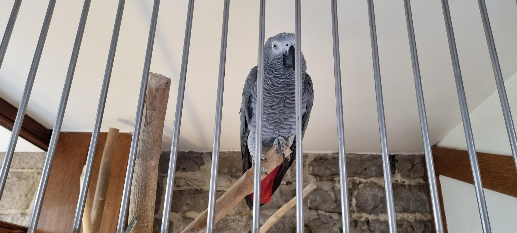 De papegaai was vrolijk aan het fluiten en riep de hele tijd bonjour, bonjour, zo gezellig.