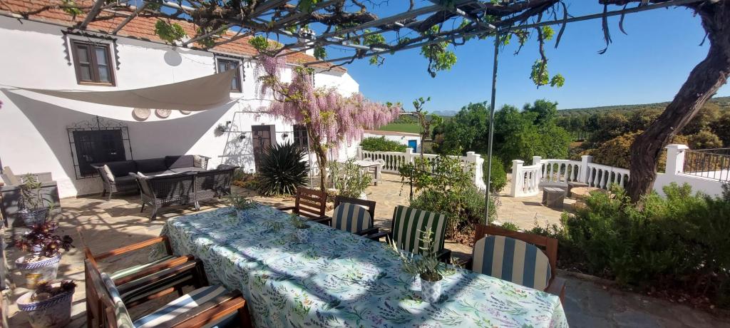 We hadden een nieuw tafelkleed met olijfjes erop gekocht gisteren bij de chinees voor de grote tafel en de oude ging nu naar de kleine tafel, wat bijzonder mooi staat onder de bloeiende wisteria.