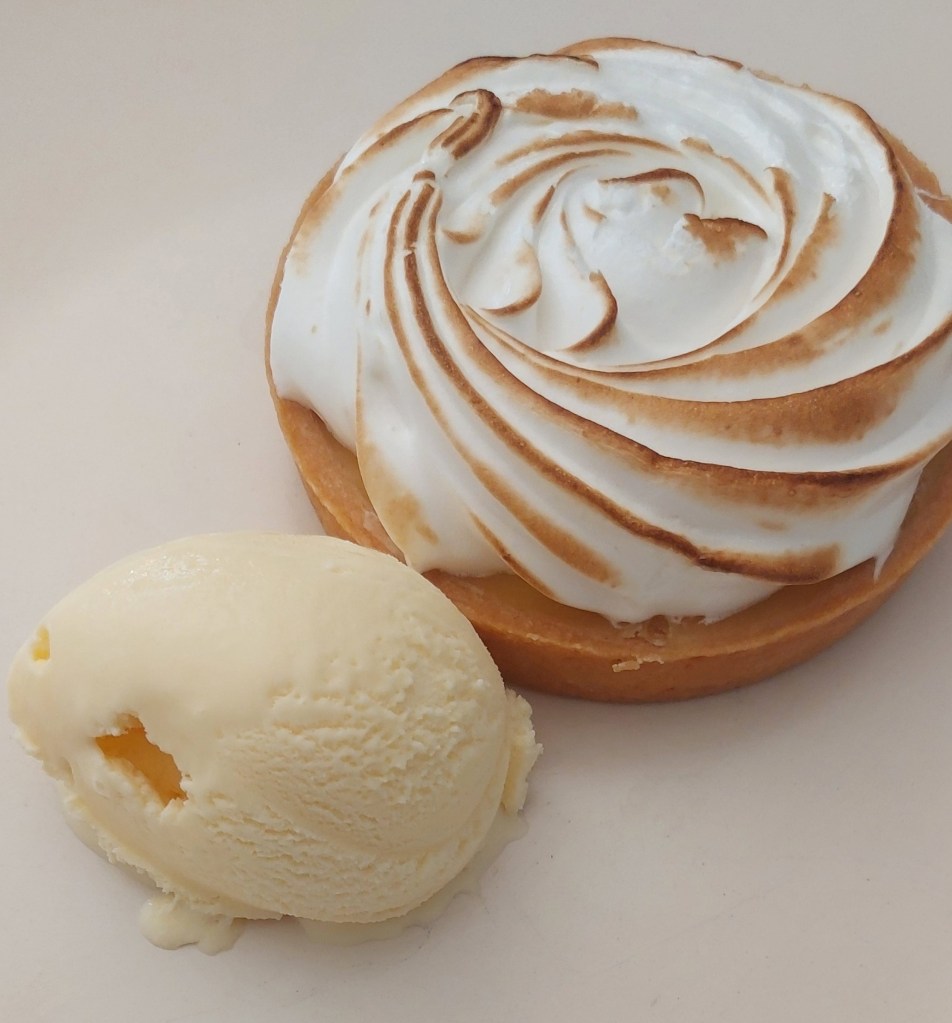 We hadden dit keer gekozen als voorgerecht voor Lesley de sate en voor mij een viskoekje. Als hoofdgerecht namen we beide de kip met patat met koolsalade en toe een lekker citroen taartje.