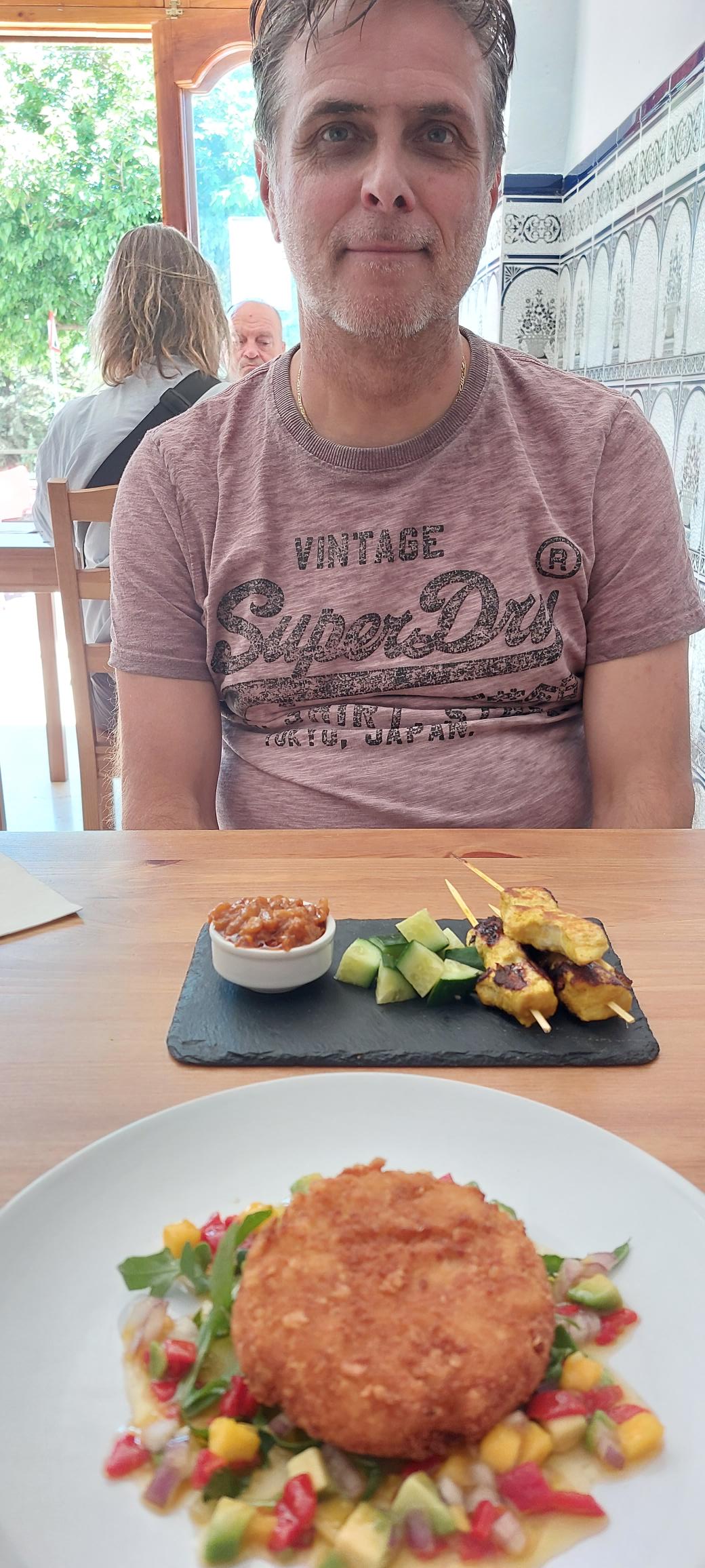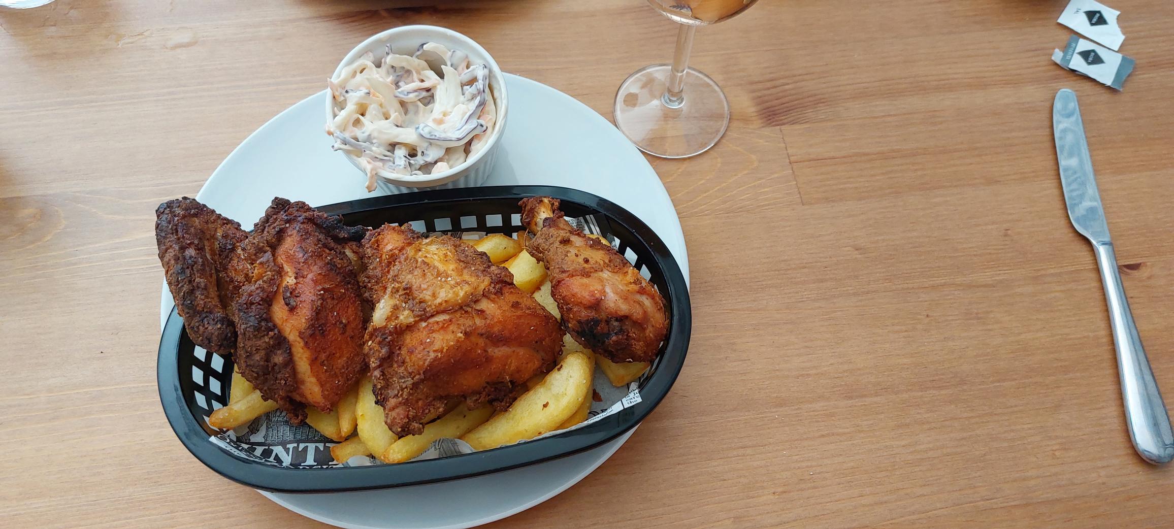 We hadden dit keer gekozen als voorgerecht voor Lesley de sate en voor mij een viskoekje. Als hoofdgerecht namen we beide de kip met patat met koolsalade en toe een lekker citroen taartje.