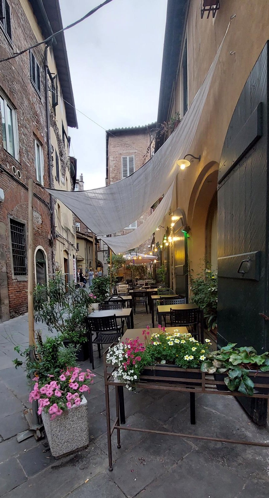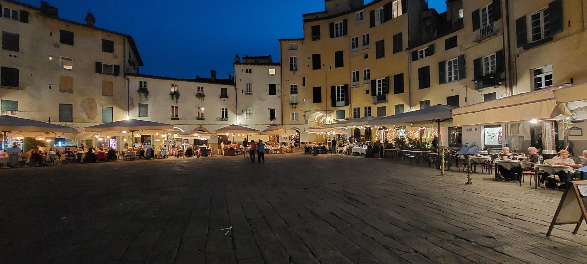 Het straatje van het restaurant ligt naast het grote plein Piazza dell’Anfiteatro die s’avonds ook heel sfeervol verlicht is. Wat een heerlijke start van onze mini road tour door Italië. Echt genieten dit!