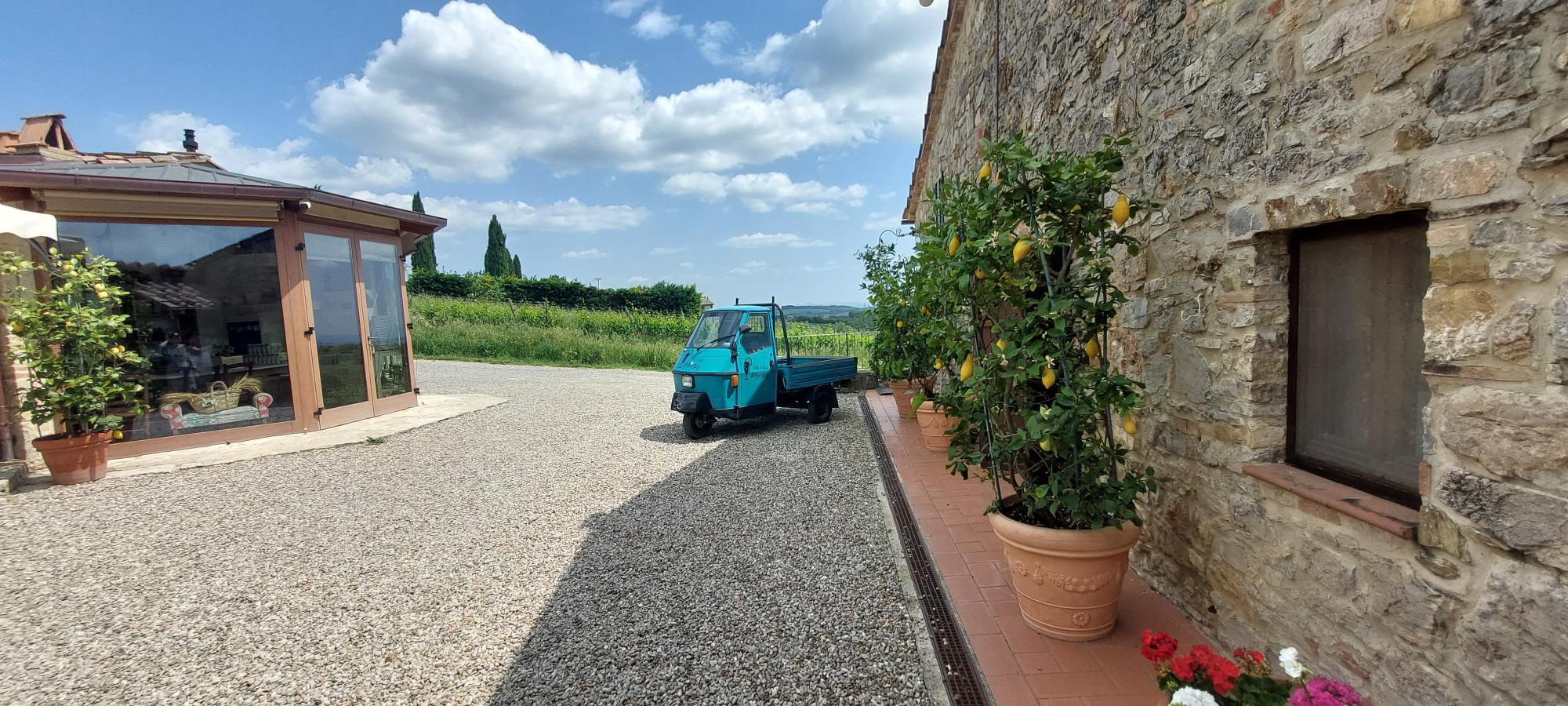 Dat vind ik nu leuk hé zo’n spontaan gevonden plekje. Zo hebben we er meer ontdekt want nog geen uurtje rijden vanaf onze lunch plek reden we voorbij het piep kleine dorpje Castelnuovo Berardenga en daar zagen we een leuke kar buiten staan en een pijl die naar een restaurant wees.