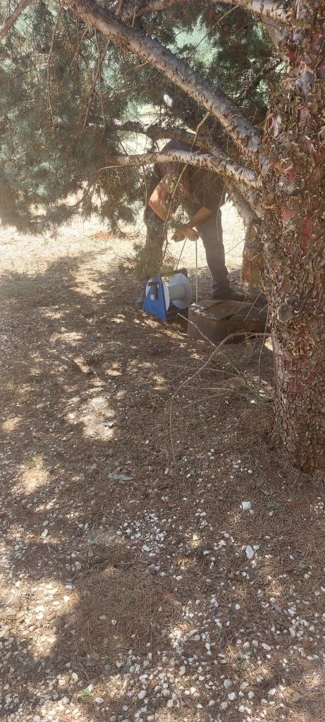 De jongeman sprak redelijk goed Engels en vertelde dat hij de diepte kon meten van de putten hij had speciale spullen daarvoor mee genomen, de pozo negro blijkt 40 meter diep te zijn. Het meten van de waterput die onder de dennenbomen ligt lukte niet want na 300 meter was hij nog niet bij de bodem en groter was zijn meetapparaat niet, echter toen hij het touw met het loodje weer omhoog haalde bleken er knopen in te zitten dus wellicht was dat de reden dat de bodem niet gehaald werd. Helaas ging hij dus zonder watermonster weer terug naar Malaga. Geen idee of hij nog terug komt. Het was eigenlijk ook veel te warm voor dit klusje. Ook zaten er teken onder de naaldbomen en dat is ook geen pretje.