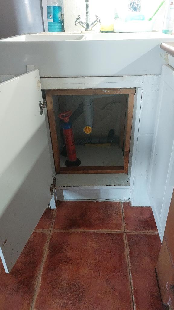 Wat we ook probeerde niks hielp, het water liep niet weg. Tevens is alles houtje touwtje aan elkaar geknoopt, dus het wasbakjes in de grote badkamer en de wasbak in de bijkeuken zitten hier ook op aangesloten, als het dus in de keuken niet doorloopt hebben we daar ook een probleem.