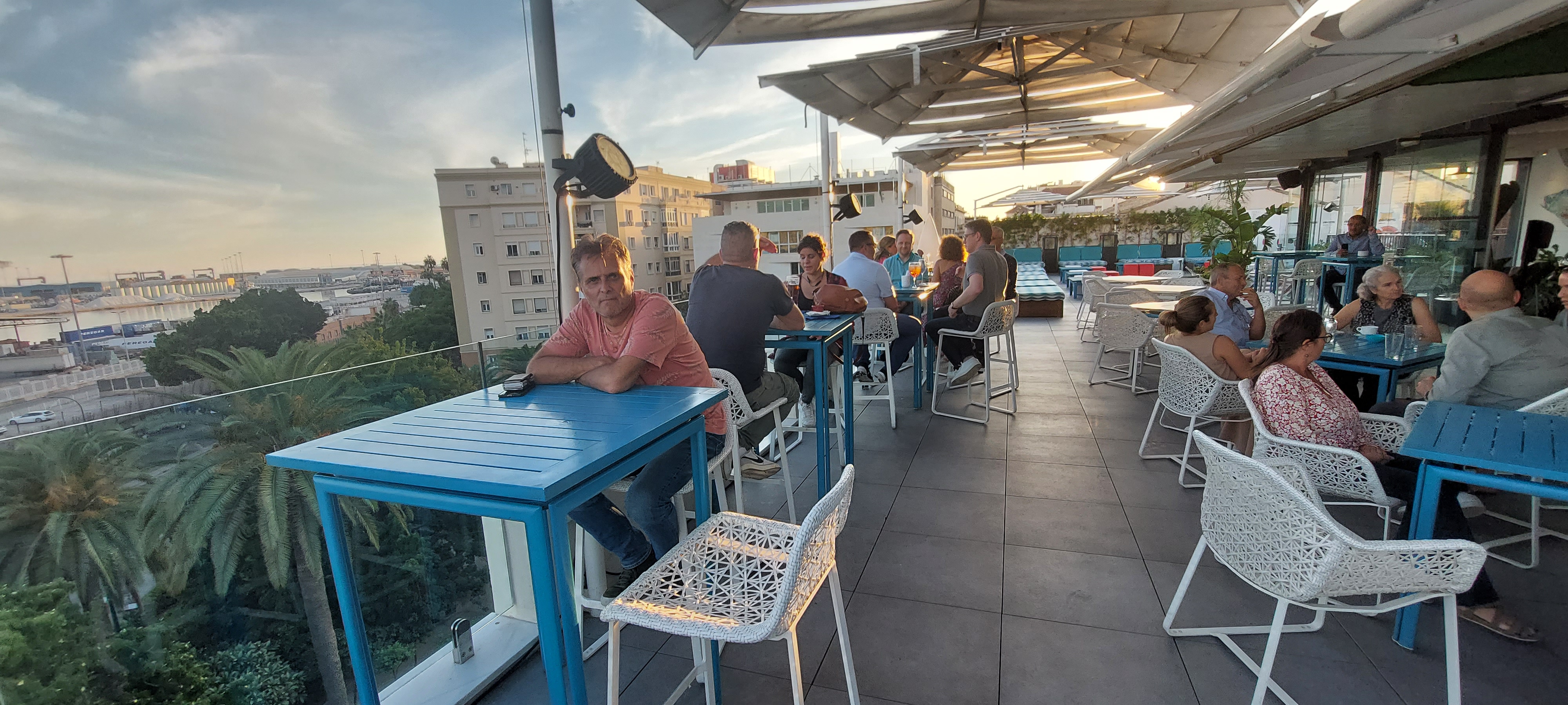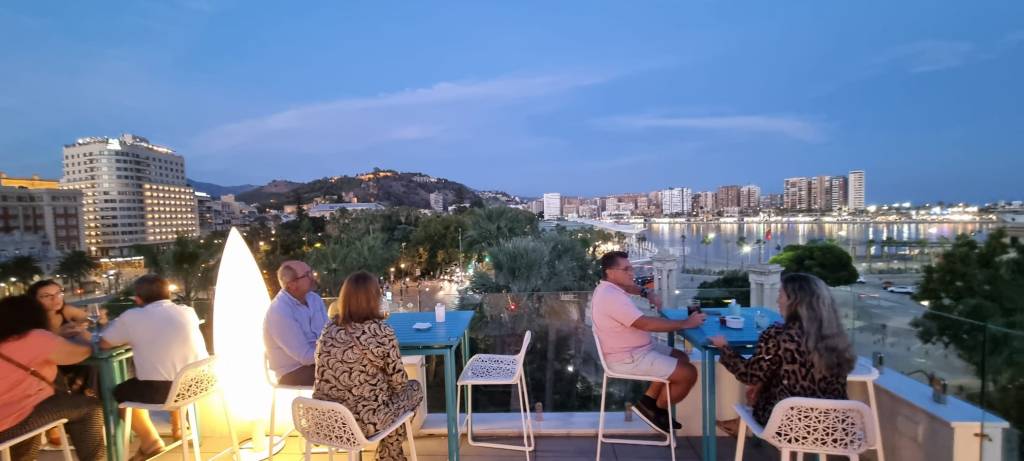 Malaga heeft een aantal leuke rooftopbars en we zijn tot nu toe alleen maar geweest bij Batik met uitzicht op Teatro Romano en het fort Alcazaba en we zijn een aantal keer geweest bij het dakterras op de 15e verdieping van Hotel AC Malaga met prachtig uitzicht over de stad en de haven en ook hebben we gezeten op het dakterras bij Corte Ingles maar nu wilde ik graag naar hotel Room Mate Valeria en deze bleek te zitten naast het bedrijfje waar we in het verleden regelmatig fietsen gehuurd hadden.